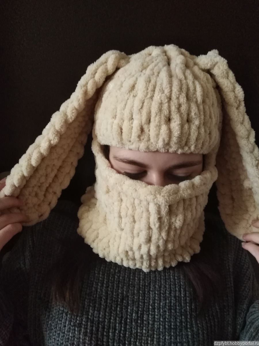 Пушистая Балаклава с заячьими ушками связана вручную из пряжи «Ализе пуффи».