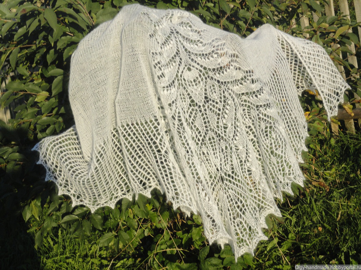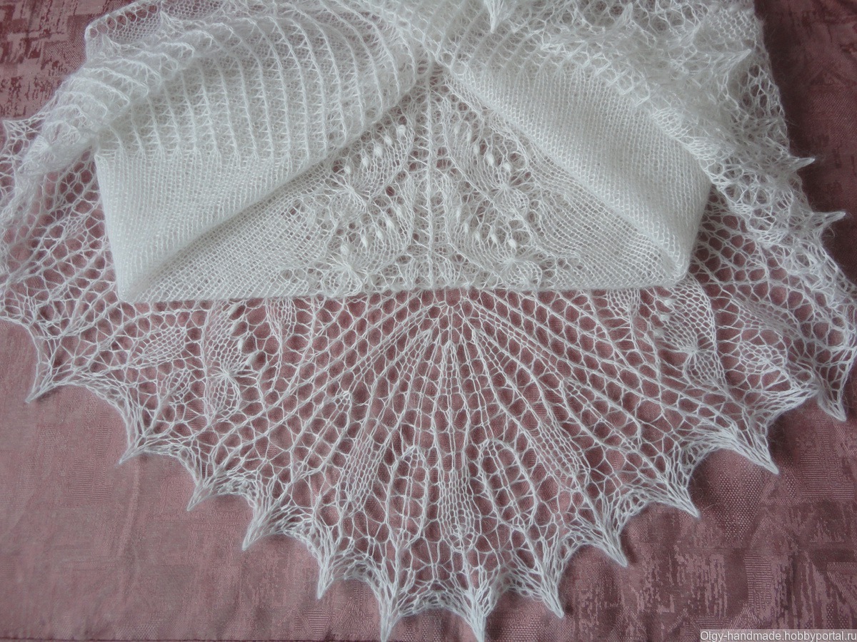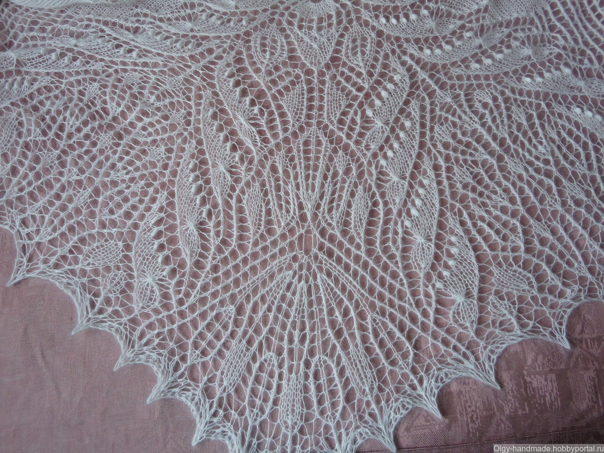 Шаль связана из мохера с добавлением шерсти,необычайно легкая и мягкая,имеет треугольную форму