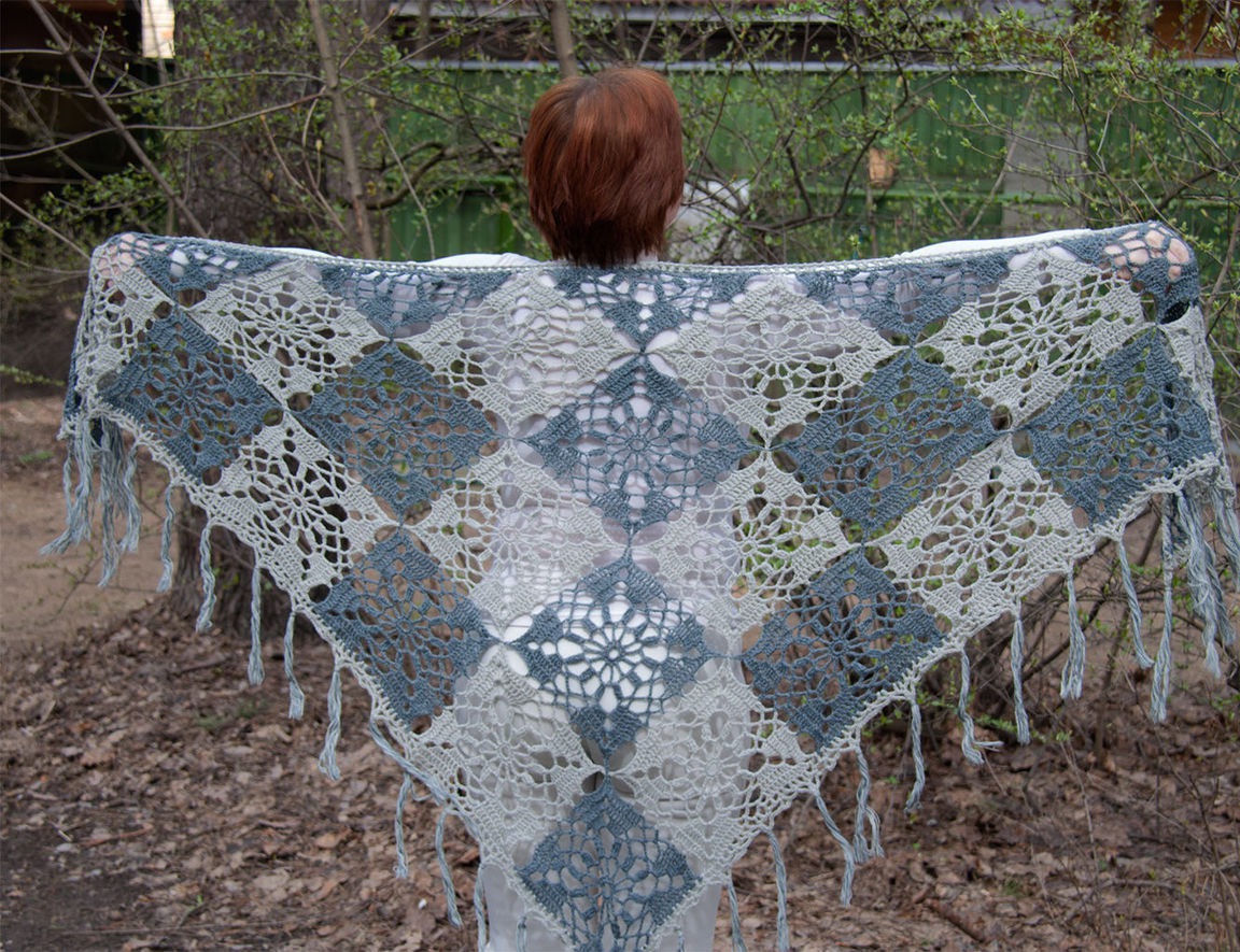 шаль крючком, комбинированный, шаль ручной работы, шаль из шерсти, купить шаль, шаль крючком ажурная, теплая шаль, подарок женщине девушке, большая шаль, шаль из мотивов, шаль чистошерстяная, двухцветная шаль, шаль в серых тонах