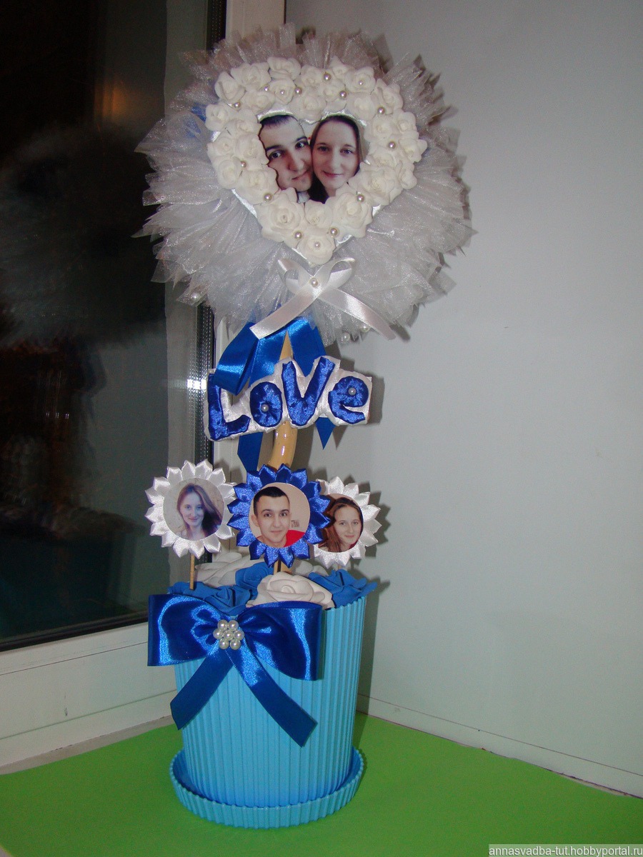 Топиарий ручной работы оформлен осчновным материалом органза, розы ручной работы из фоамирана , украшен атласными лентами ! Сочетания белого цвета с синем предают изделию изысканность и богатый вид