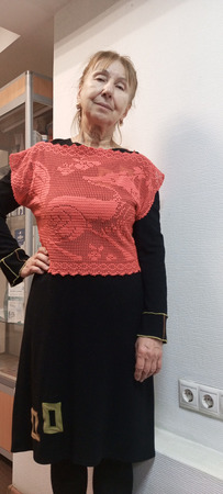 Ручная работа крючком - филейная вязка из тонких ниток (итальянский ирис). Рисунок авторский. Модель задумана на изящную фигуру свободно поверх классического маленького черного платья без рукава, но может подойти и на полную фигуру внатяг.