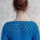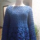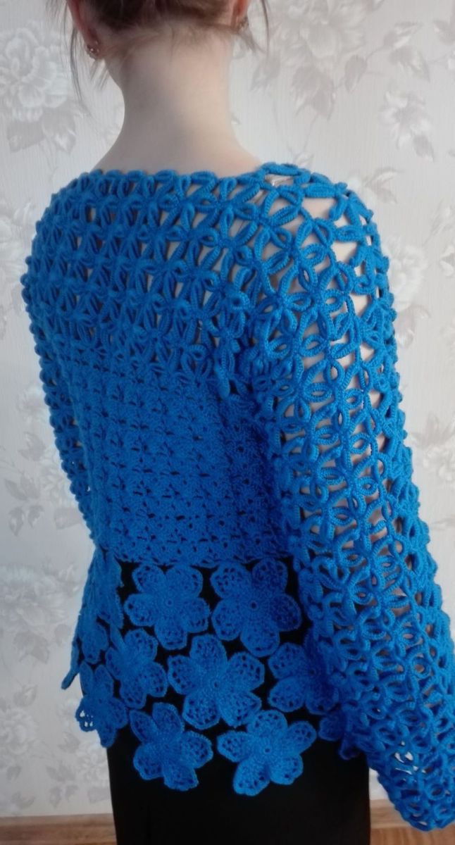 Эта оригинальная модель кофточки глубокого синего цвета выполнена в 44-46р Верхняя часть связана в технике безотрывного вязания, нижняя- Ирландское кружево. Прозрачные рукава в зоне Декольте придают женственность и нежность.