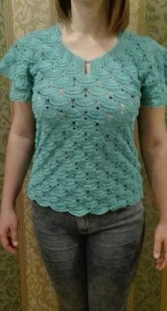 Блузка нежно бирюзового цвета выполнена в технике безотрывного вязания. Кофточка имеет модный свободный силуэт и отлично подчеркивает фигуру. Можно связать юбочку для создания полного комплекта