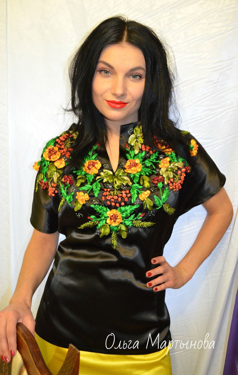 блуза из костюмной ткани черного цвета украшена вышивкой лентами авторская работа . идеально подходит как нарядная одежда так и для повседневной носки .в таком платье вы будете чувствовать себя удобно и комфортно привлекая взгляды окружающих