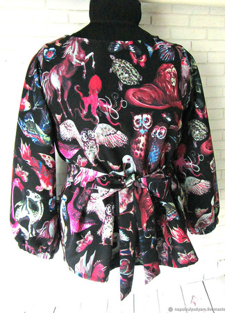 Блуза с принтом Зоопарк из крепа барби стрейч. Блуза с баской ( волан по низу), пышные рукава и по талии на резинке. Горловина лодочкой. В комплекте есть пояс длиной 2 метра. Блуза подойдет на грудь 88-92 см, длина 60 см. У меня на фото грудь 90 см, у манекена 92 см.
