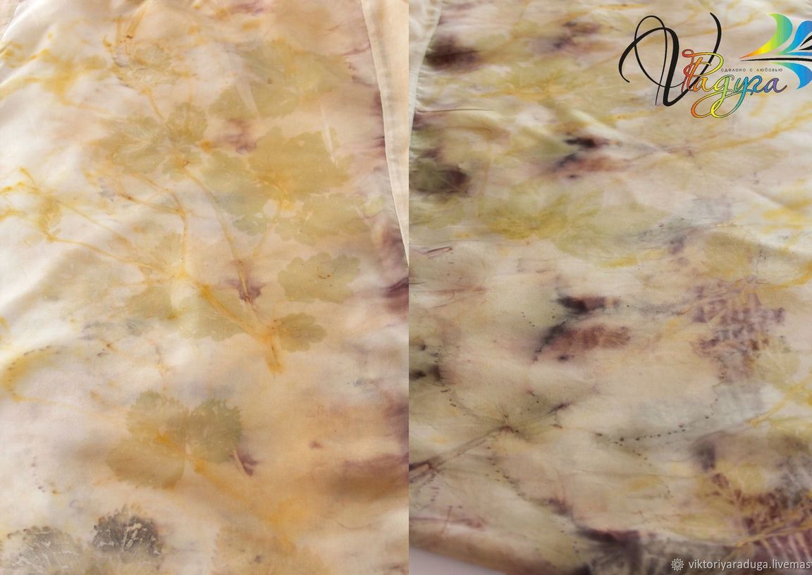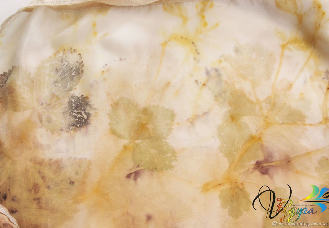 Окрашивалась только листьями растений. Никакой синтетики и химии! Гармоничные натуральные цвета. Удивительный танец из отпечатков листьев на шелковой вставке по переду и спинке блузы. Клубника, папоротник, крапива, чистотел. Можно рассматривать бесконечно!