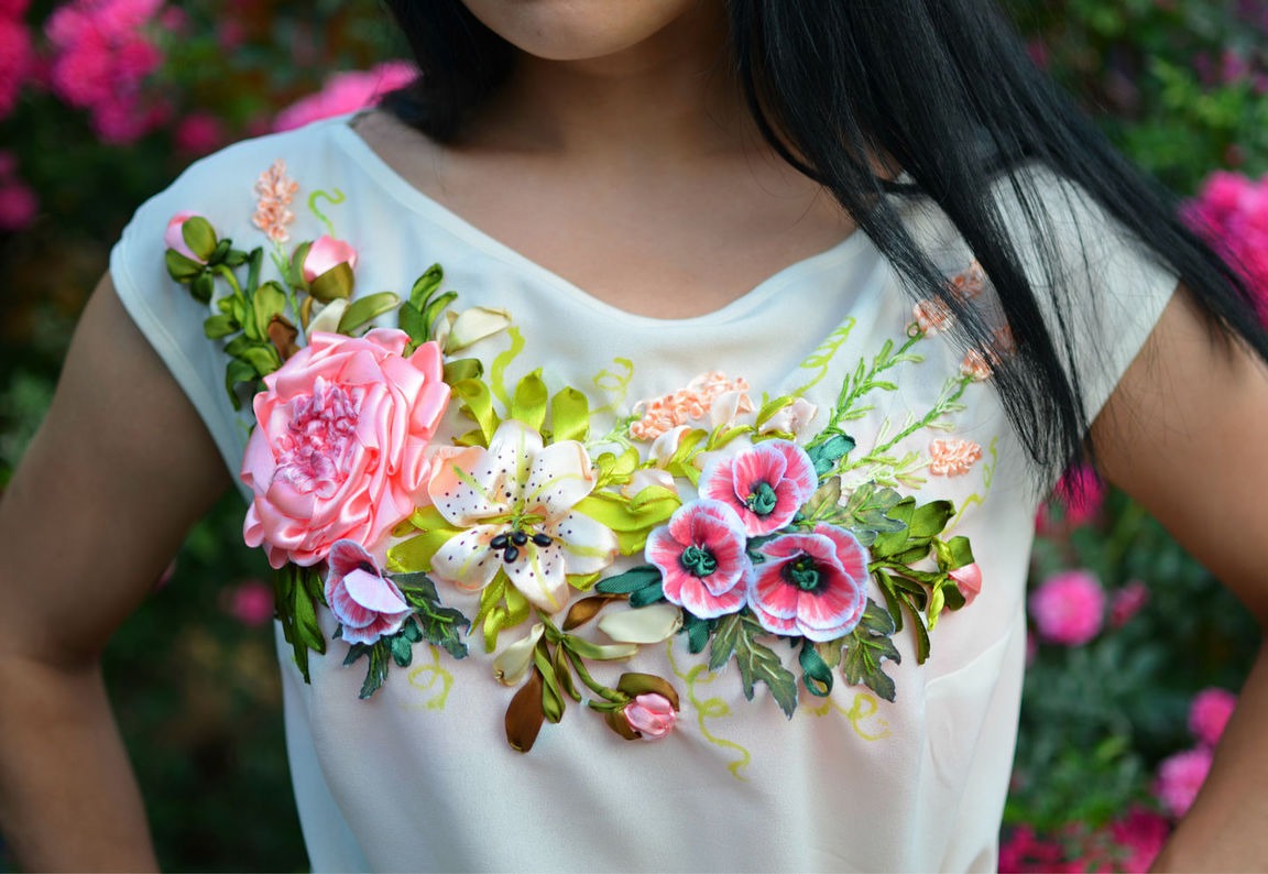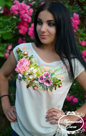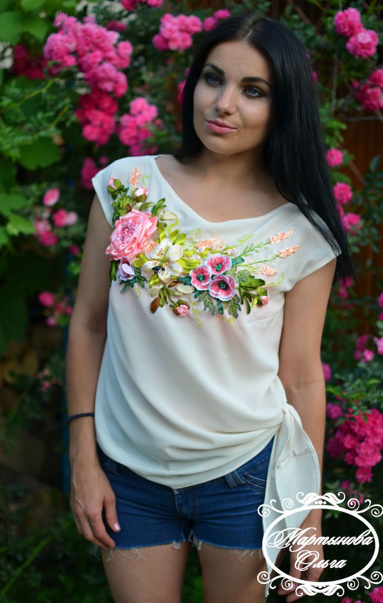 блуза из крепшифона украшена вышивкой лентами авторская работа . идеально подходит как нарярадная одежда так и для повседневной носки .в таком наряде вы будете чувствовать себя удобно и комфортно привлекая взгляды окружающих