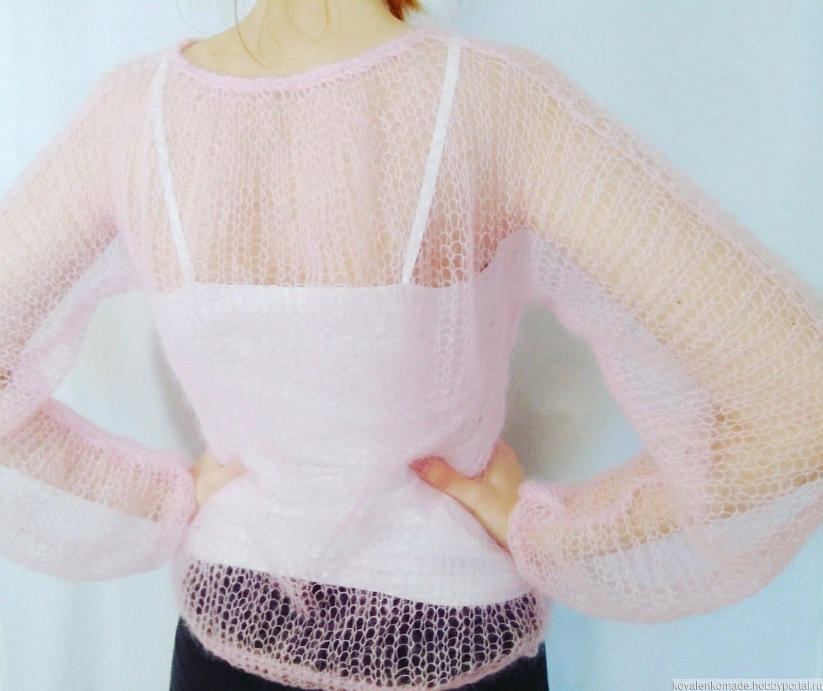 Блузка из мохера на шелке, нежная и невесомая, вес блузки всего 40 гр,Смотрится как вуаль, можно носить поверх маечки или водолазки. На ощупь потрясающе нежная, так и хочется прикасаться бесконечно. Производит впечатление, вы будете в центре внимания и услышите массу комплиментов.