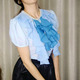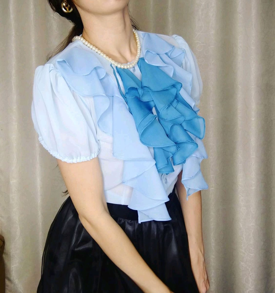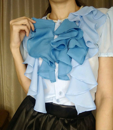 Блузка из шифона трёх оттенков голубого. Широкие красивые воланы, рукава-фонарики на резинке.