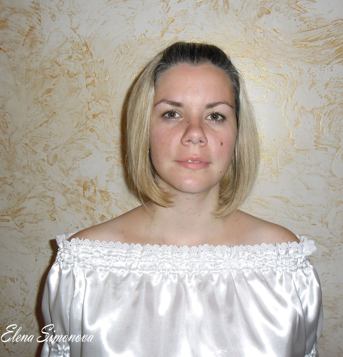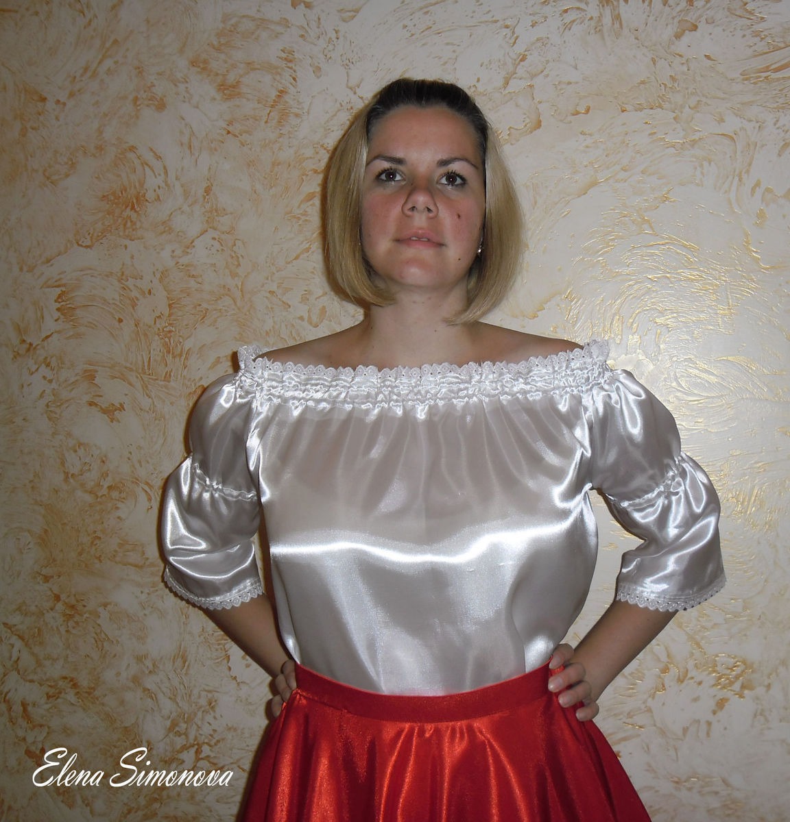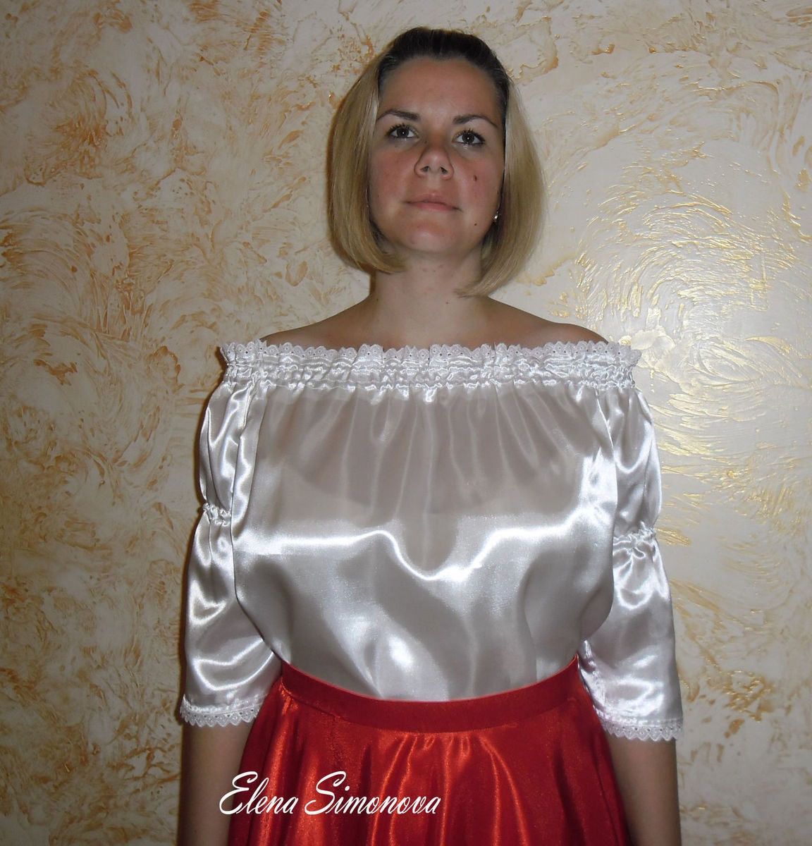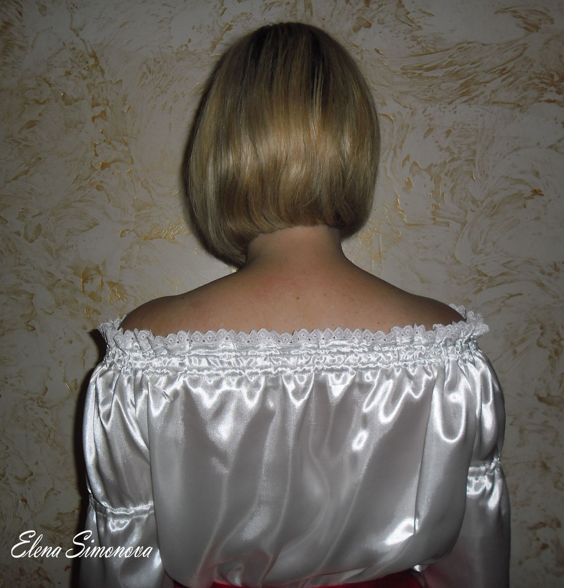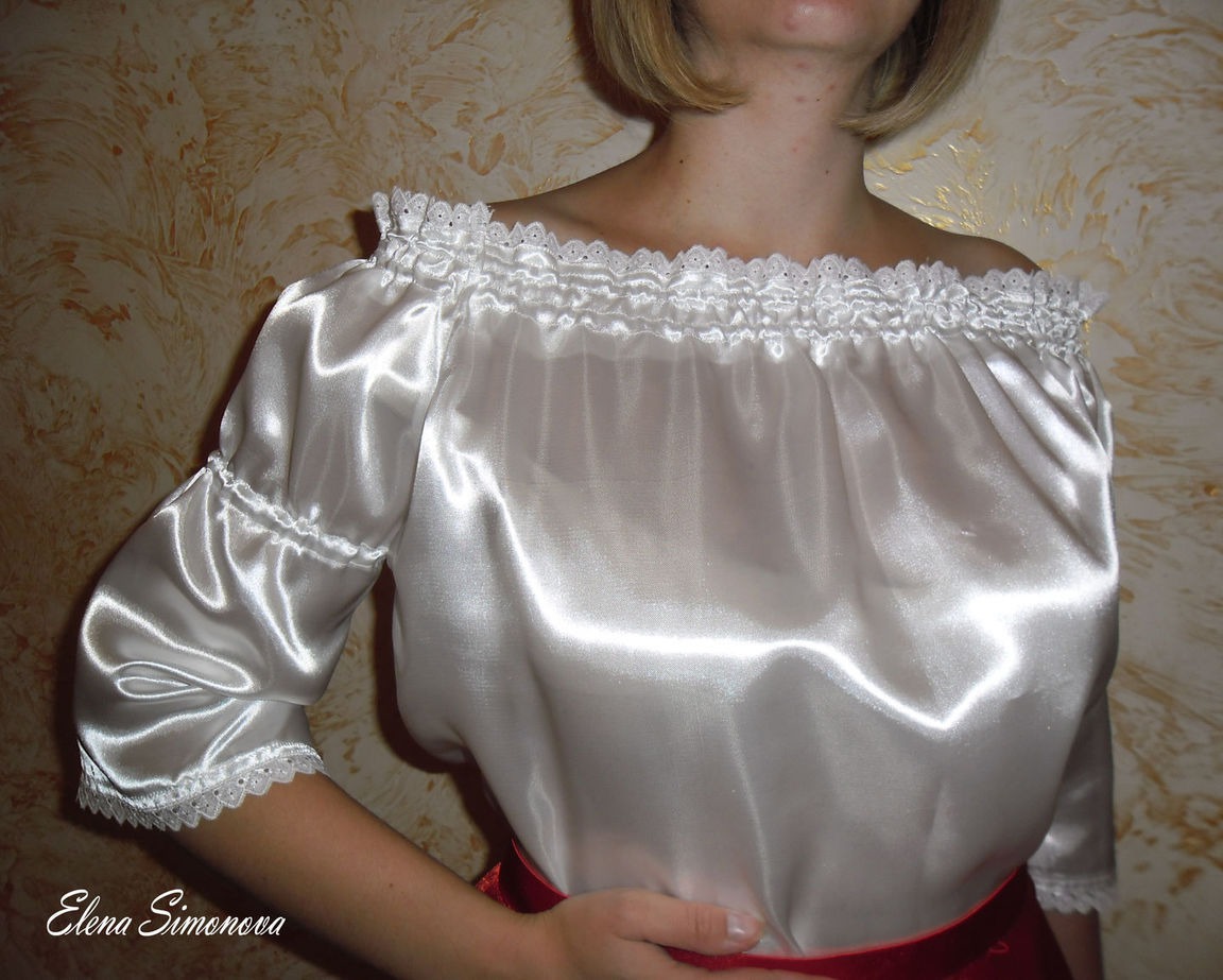 Блузка с открытыми плечами выполнена из белого атласного шёлка с кружевами из шитья по плечам и по низу рукавов. Верхний вырез оформлен тройной резинкой , у рукавов резинка на уровне груди В данном варианте блузка свободная по низу.