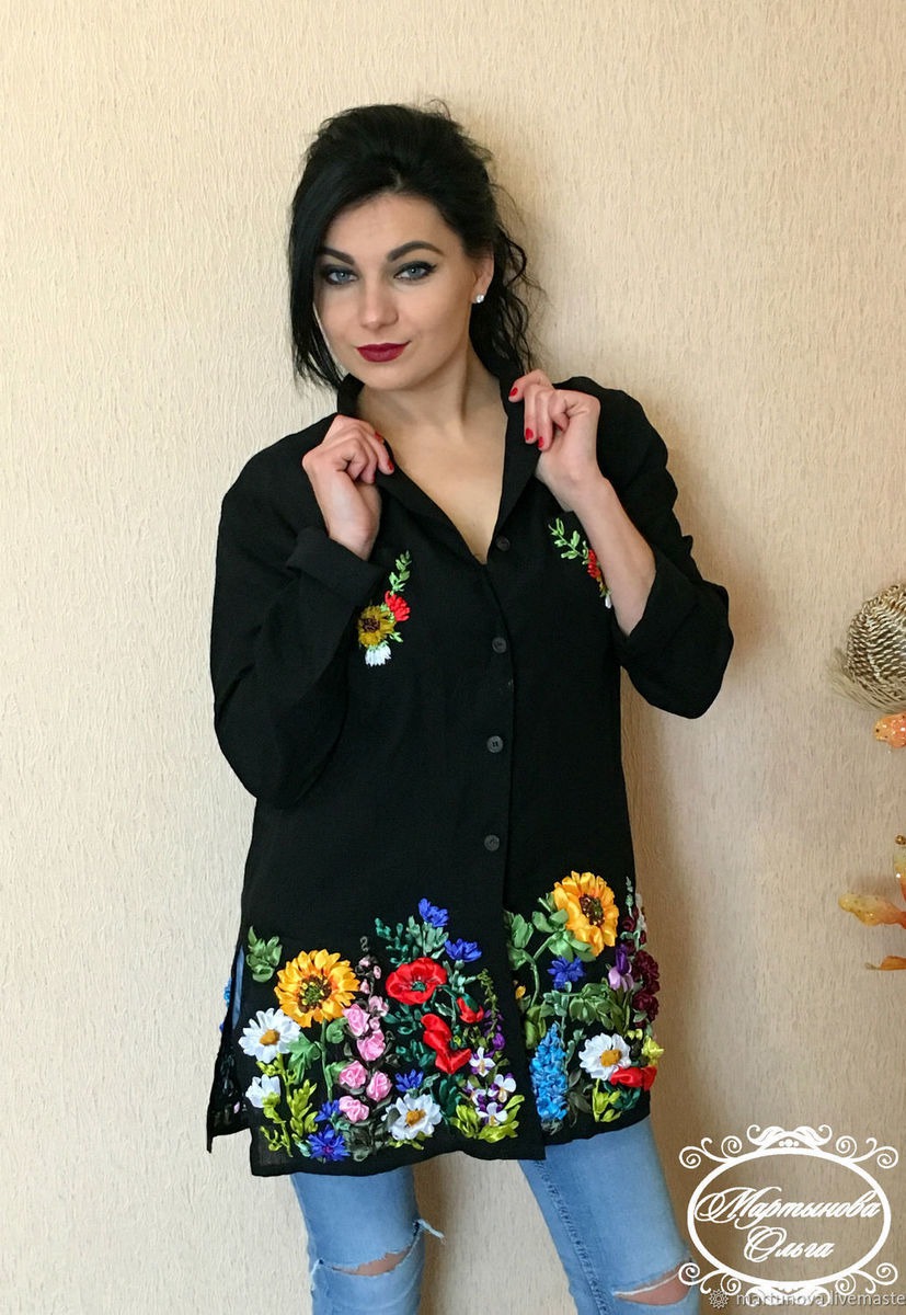 Льяная удлененная рубашка блузка на пуговицах с небольшим воротничком и длинным рукавом.так же есть два небольших нагрудных карманчика .рубашка черного цвета . весь низ рубашки вышит полевыми цветами авторская ручная работа . идеально подходит как повседневна одежда так и уникальный образ с любым видом брюк