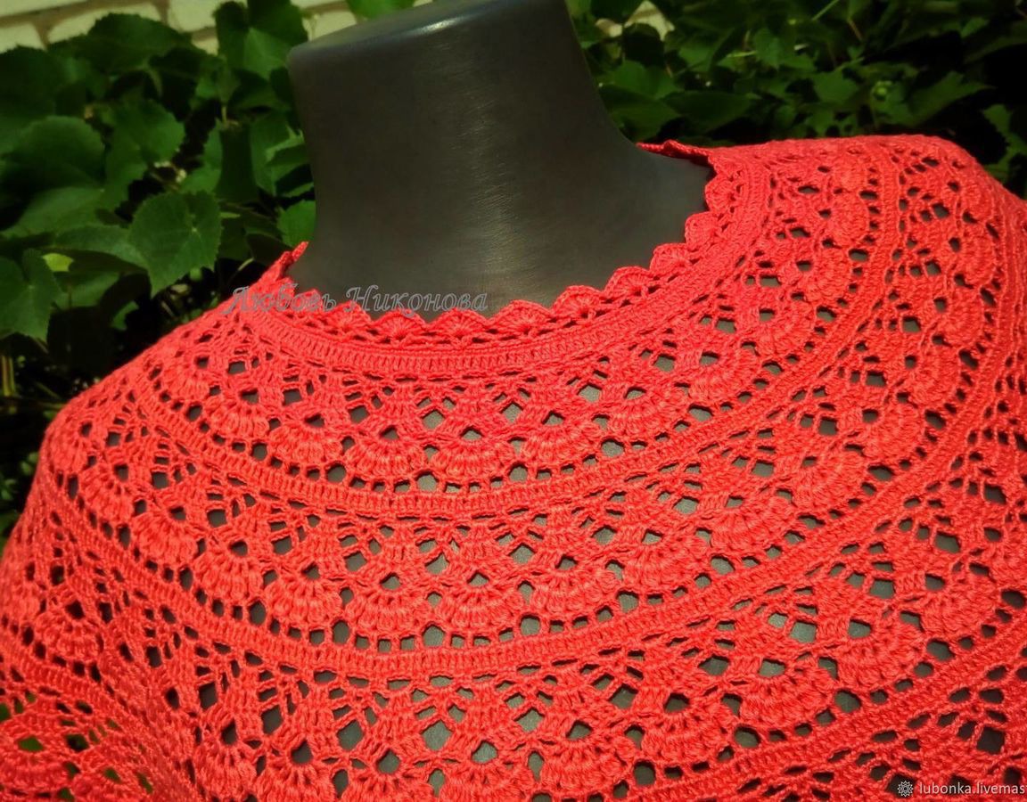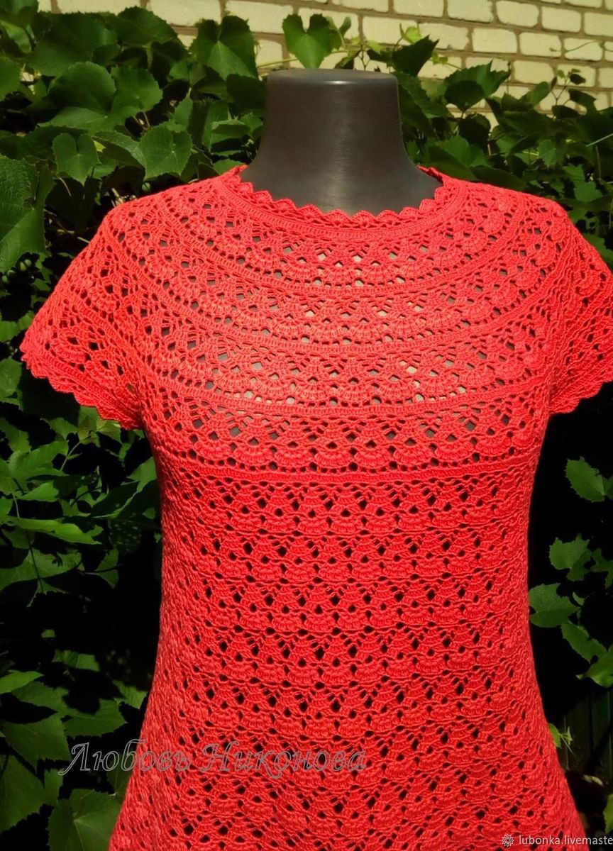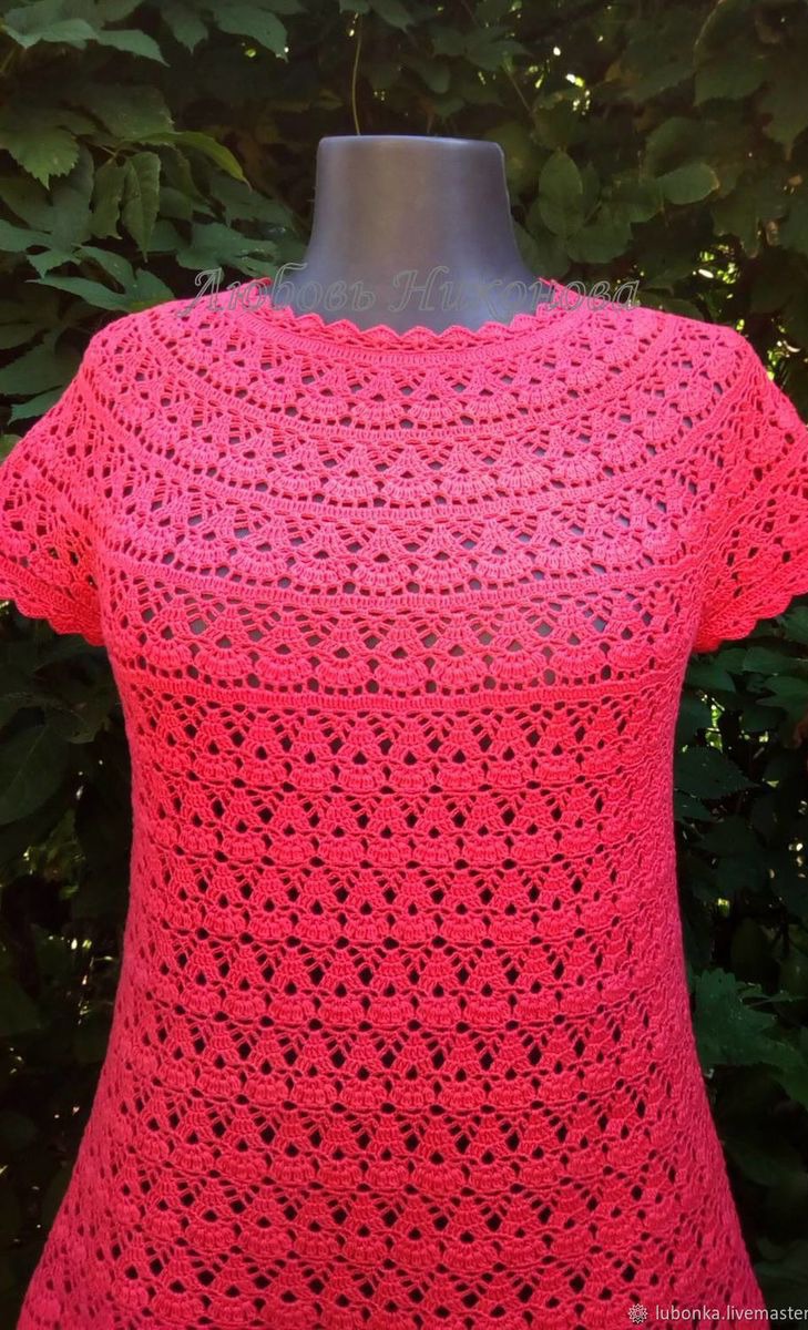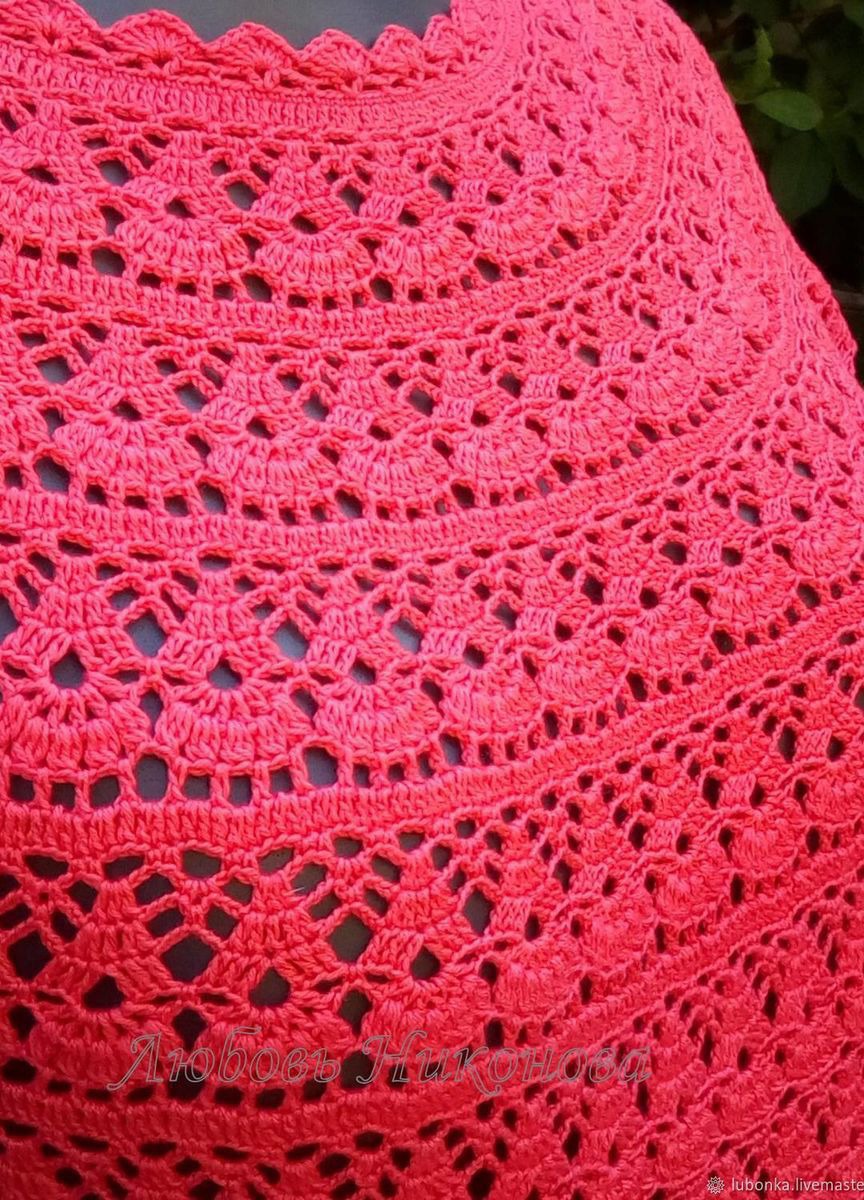 Изделие их 100% хлопка. Цвет такой как вам нравится. Если не подходит размер, то я вам свяжу по вашим мерочкам. И цена приемлемая. Изделие связано без единого шва. Длина 63 см. ОГ - 100, Об - 112.Цвет изделия розовый коралл.