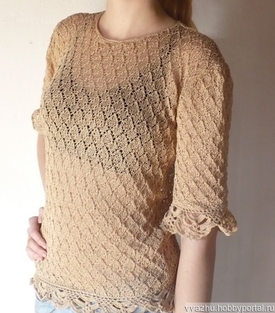 Блузка связана из хлопковой пряжи спицами. Отделка связана крючком.