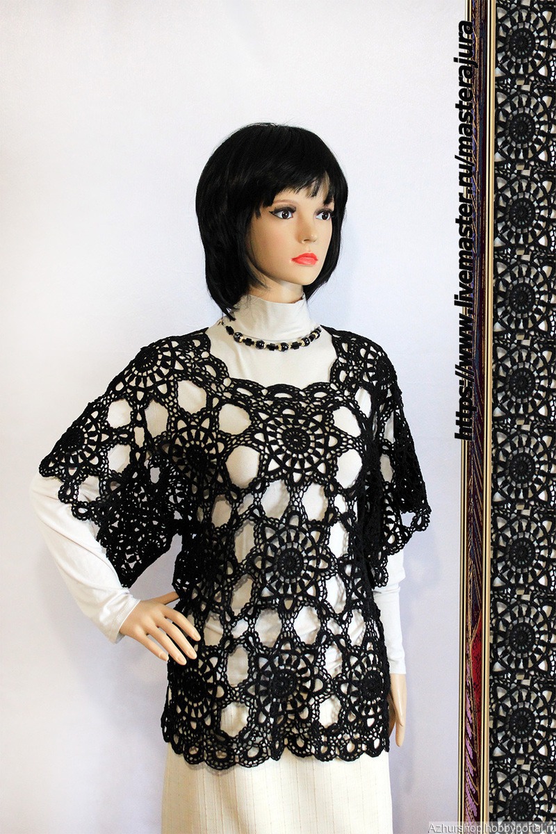 Вязаная туника крючком "Летняя ночь" такая же таинственная и завораживающая. Вытянутый силуэт свободное облегание, все это придаст стройности вашей фигуре. Черная туника выгодное решение, так как черный насыщенный цвет идеально подойдет к любому цвету юбки или к брюкам. Вам будет легко создавать комплект одежды с вязаной туникой.. Вязаная черная туника, рукав свободный. Длина рукава от горловины 34 см, длина изделия 68 см. Удачной вам покупки!