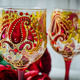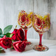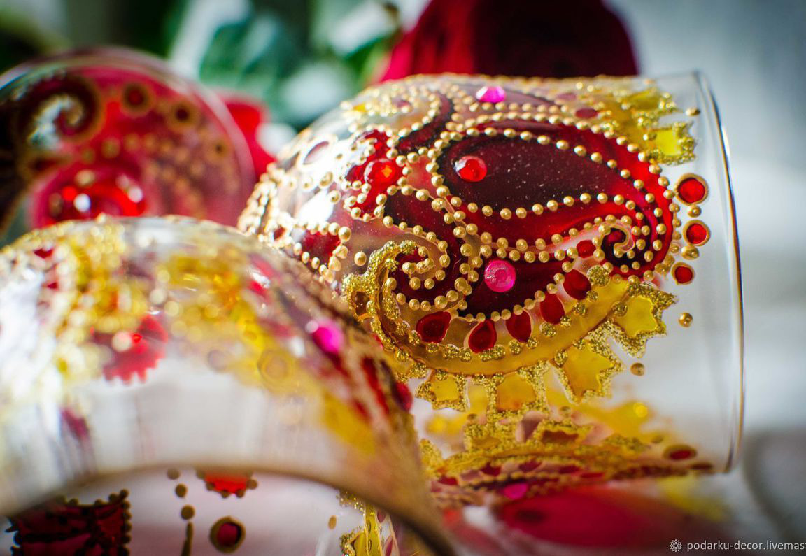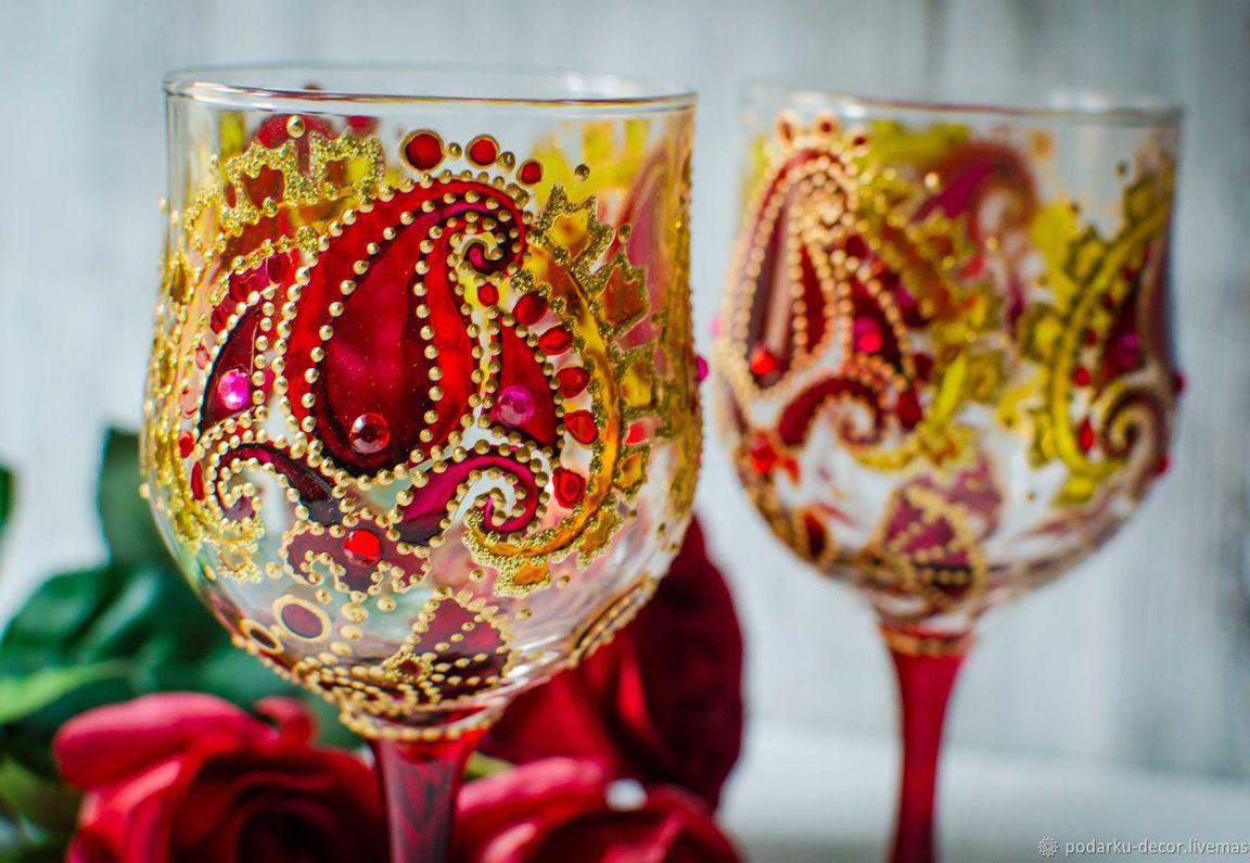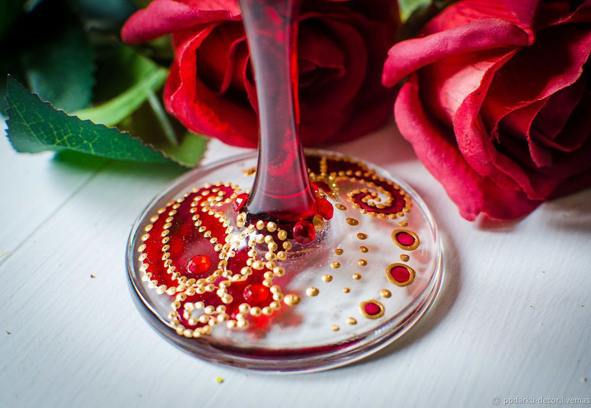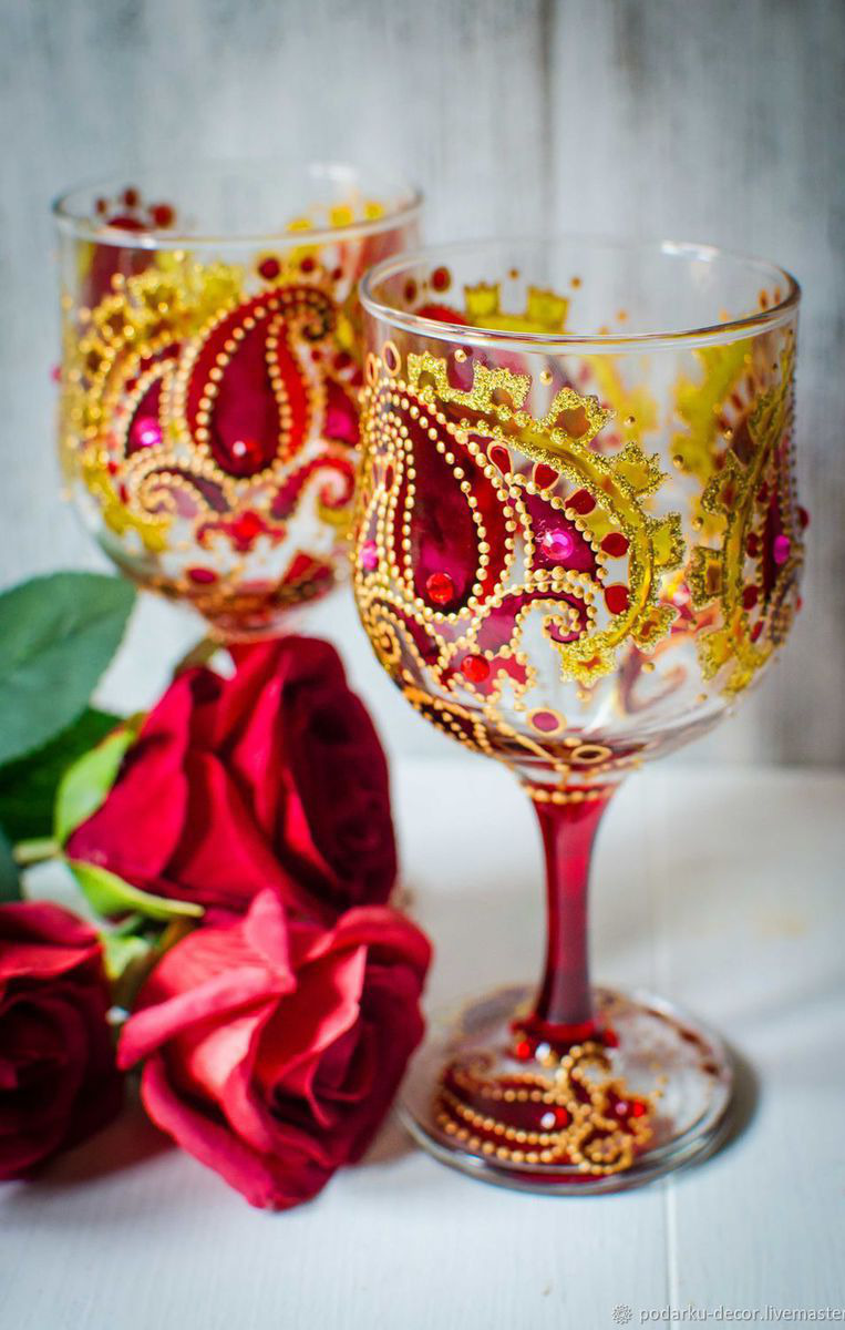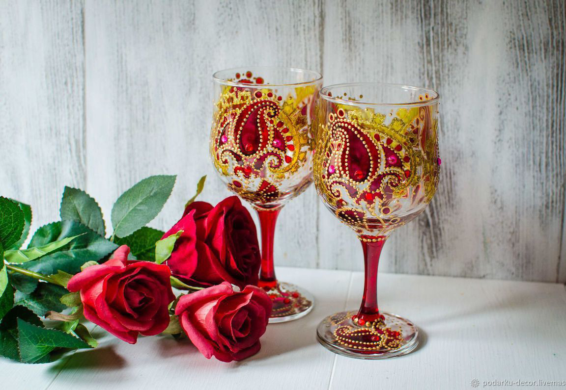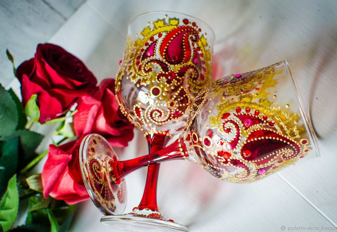Бокалы для вина выполнены в технике витражной росписи с применением страз и золотых глиттеров. Краска не смывается и не выгорает. Прекрасный подарок на юбилей, рубиновую свадьбу или день рождения. Бокалы играют в лучах света ярким рубиновым блеском. Объем 380 мл
