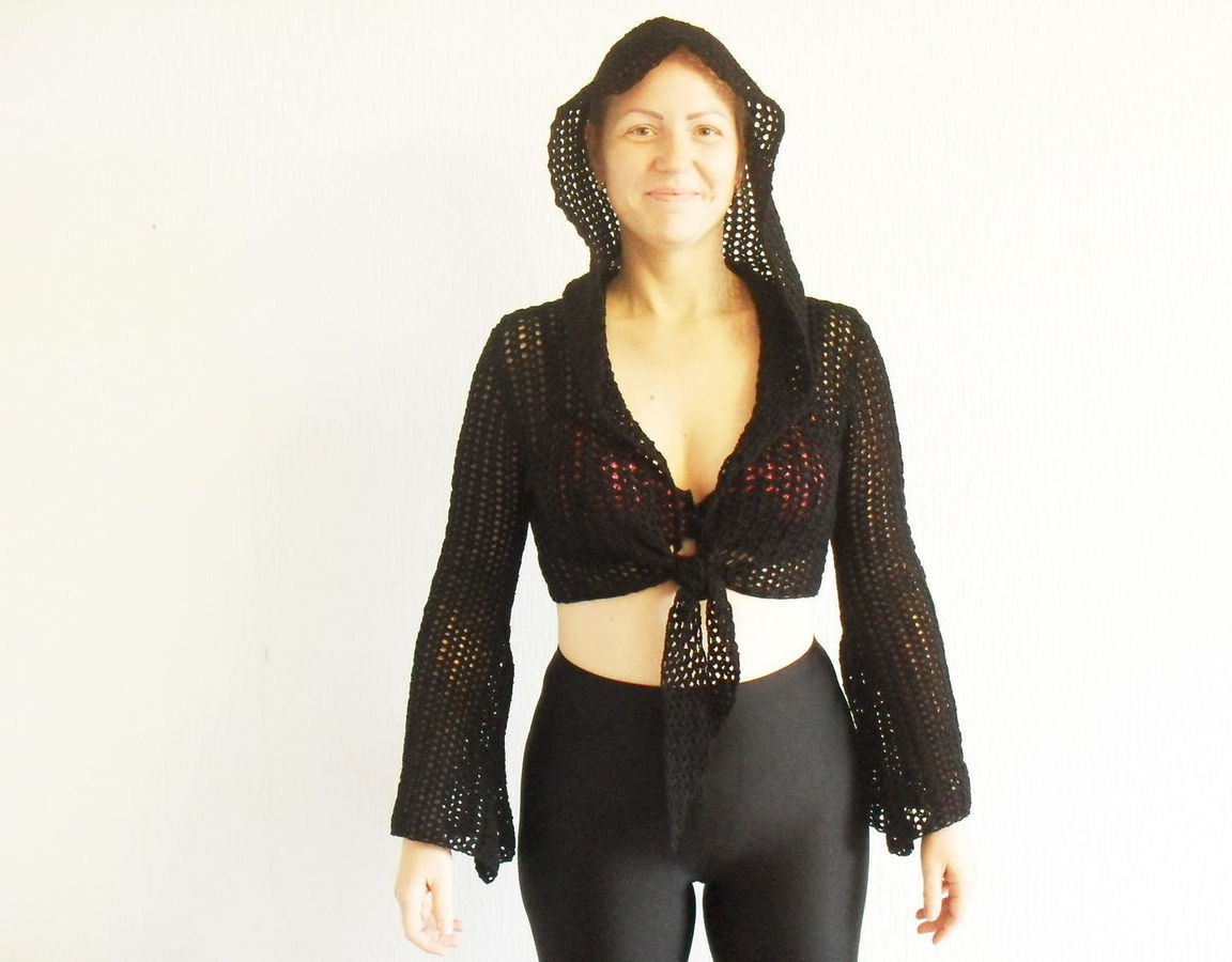 Ажурное вязаное болеро с длинным расклешенным книзу рукавом, завязками спереди и просторным капюшоном - это отличное дополнение летнего гардероба.