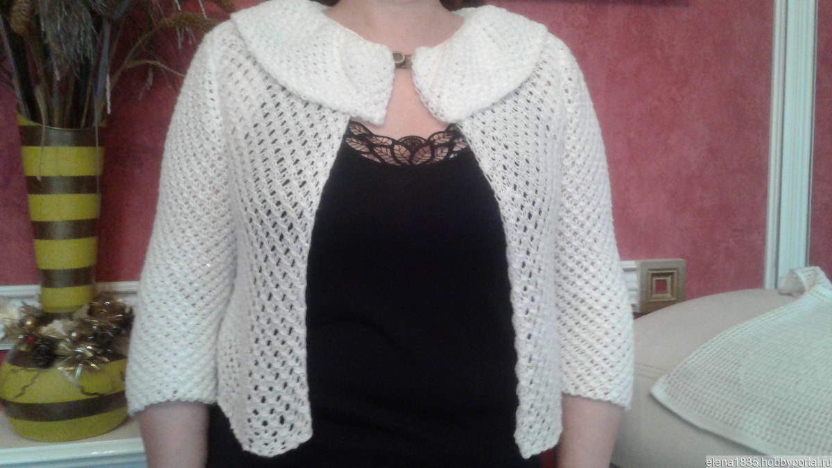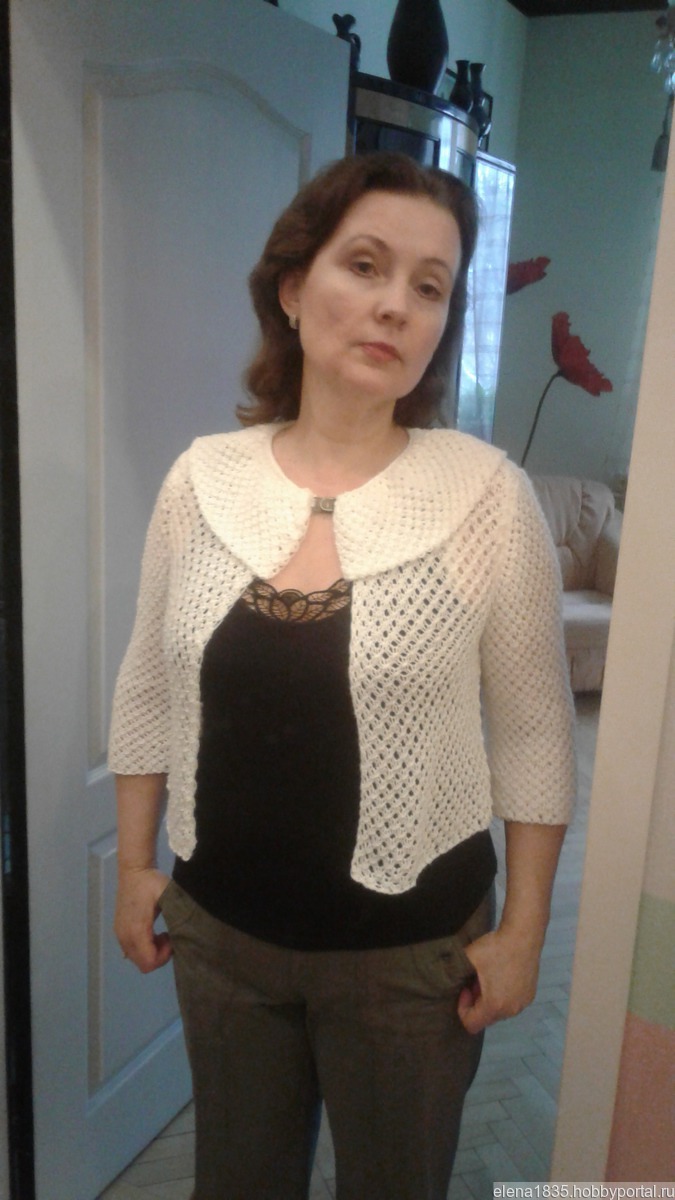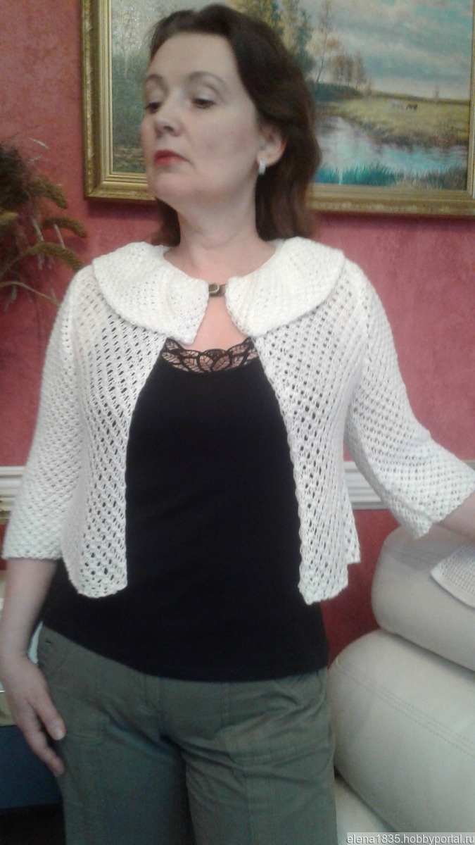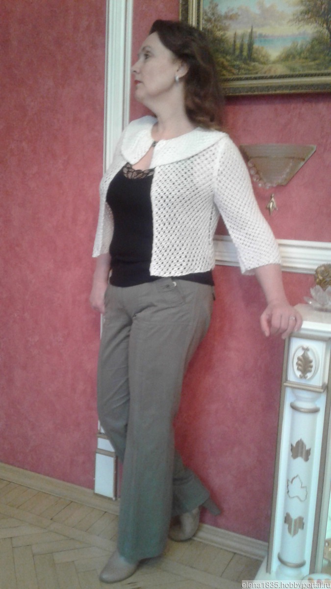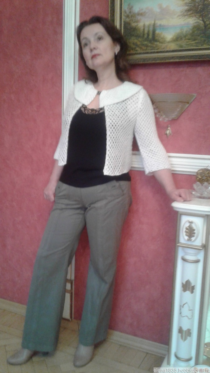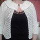 Болеро служит хорошим дополнением образа(пример на моем фото).Связан из белого акрила с мерцающим люрексом (цвет нежный розовый и зеленоватый) , хорошего качества.Можно сочетать с летним сарафаном с открытой спиной,чтобы прикрыть плечи в прохладный вечер или при выходе в театр.Женщинам элегантного возраста необходим,чтобы скрыть от постороннего глаза некоторые недочеты фигуры.