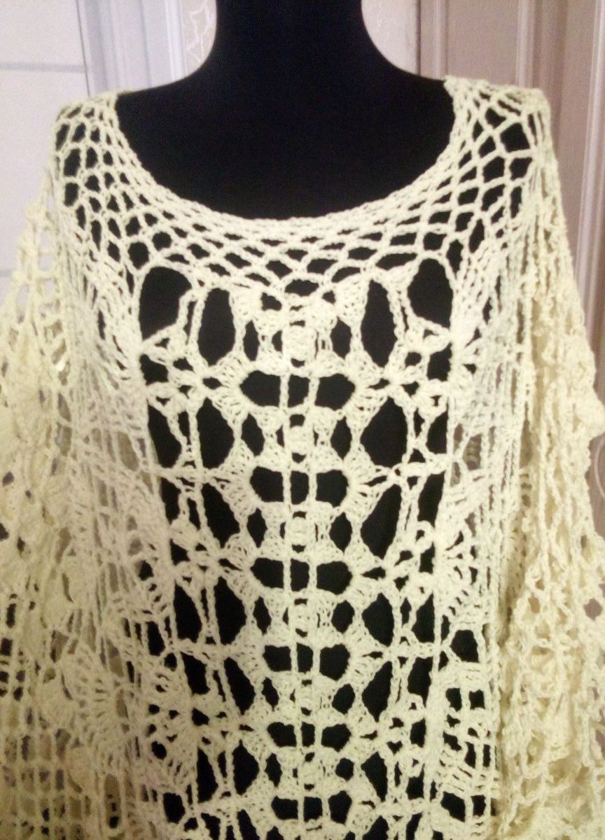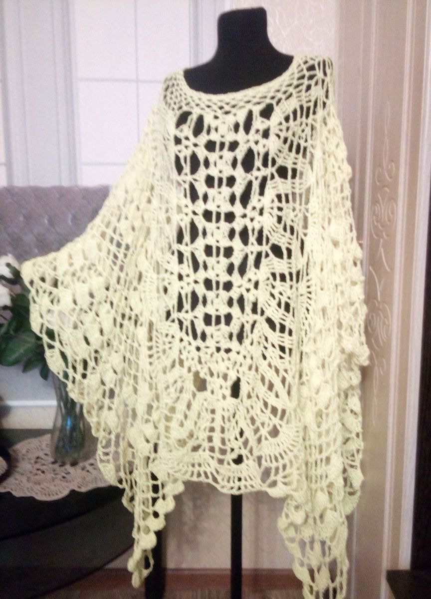 Туника-пончо связанная крючком ажурным узором свободного кроя отлично скрывает все погрешности фигуры. Необычный силуэт яркий лимонный цвет широкие рукава и свисающие углы по бокам все это придаст изюминку вашему образу. Можно использовать не только как пляжный вариант но и носить в повседневной жизни.