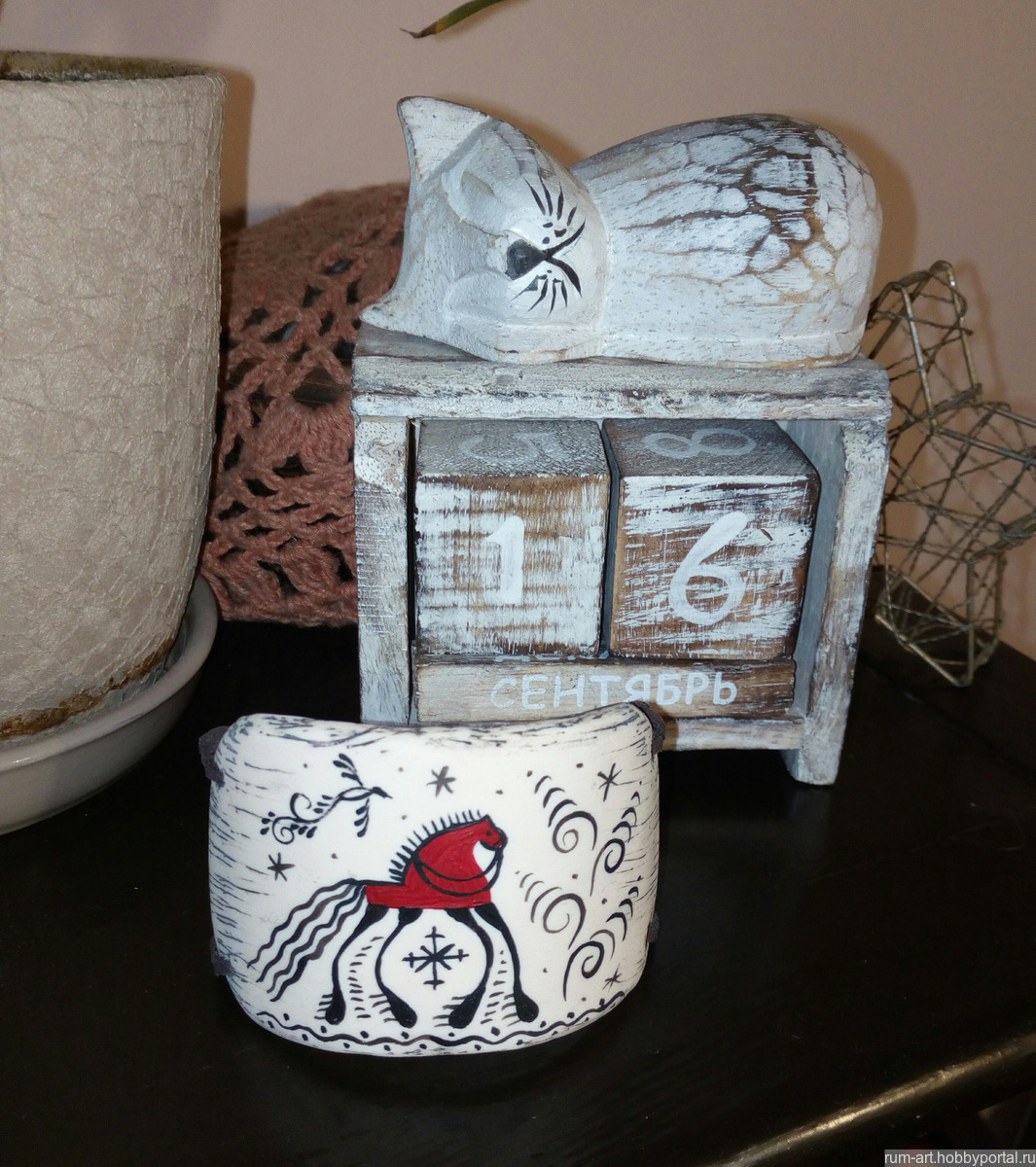 Центральный элемент выполнен из полимерной глины - имитация кости, расписан акриловыми красками элементами мезенской росписи, напоминающими наскальную живопись древних людей.