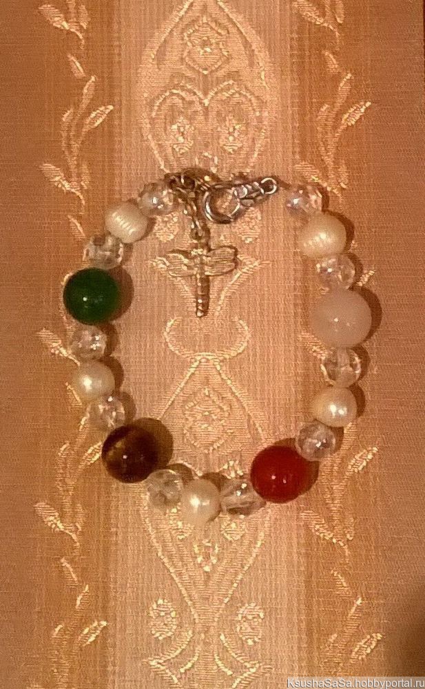 Состав: розовый кварц, сердолик, тигровый глаз, нефрит, жемчуг, ювелирное стекло. Подвеска в виде стрекозы из бижутерного сплава.