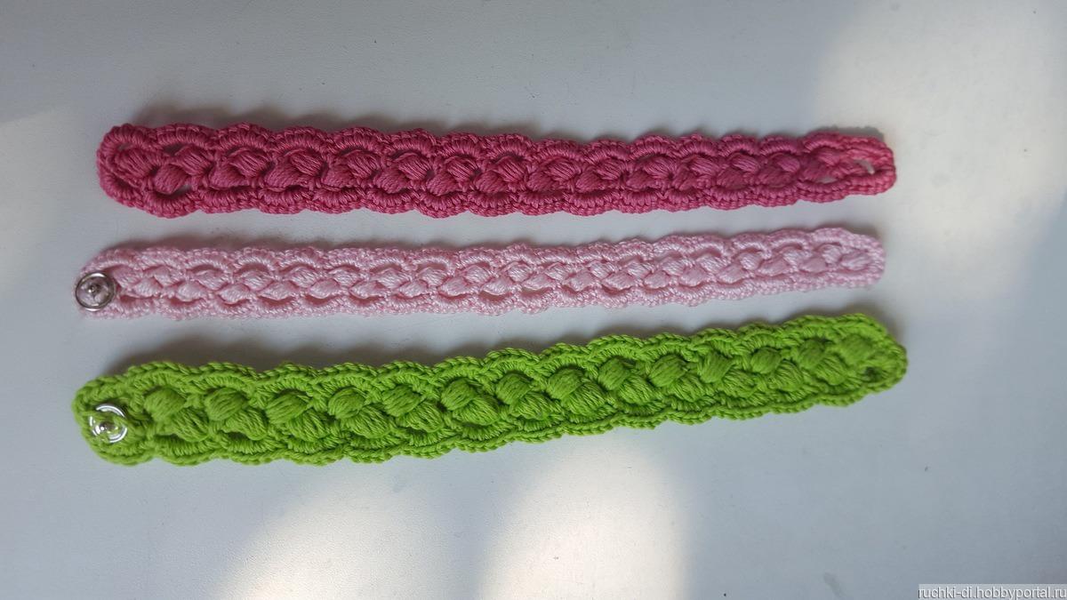 Вязаные мягкие браслеты. Удобные, легкие и прекрасно смотрятся на руке. Расцветка может быть любой. Застежка кнопочка. Так же можно изготовить на заказ и поясок.