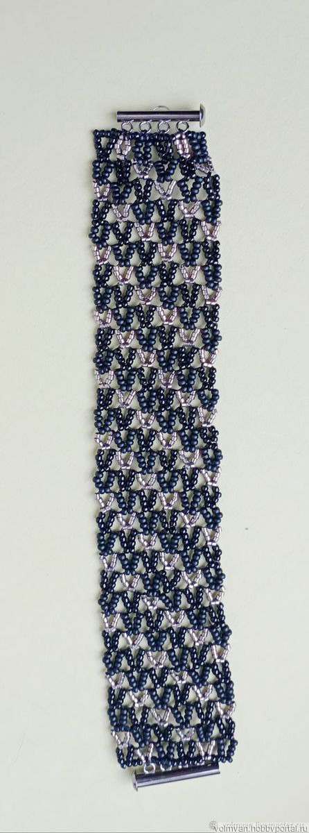 Широкий браслет из качественного бисера с удобным слайд-замком. Браслет отлично впишется в деловой образ, браслет хорошо сочетается с украшениями из серебра. Браслет легкий, ажурный.Бисерное полотно браслета комфортно в носке.