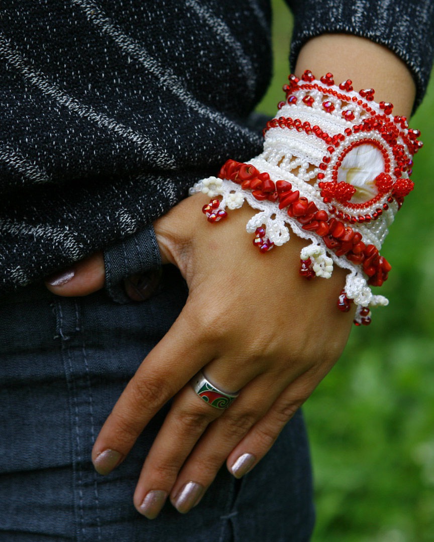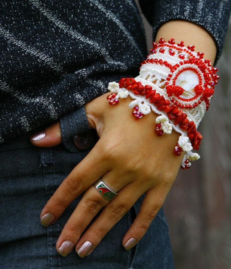 браслет из бисера, яркий браслет, авторские украшения, с натуральными камнями, авторский браслет, вязание с бисером, браслет крючком, манжета, с натуральным кораллом, манжета из бисера, манжета крючком, с натуральным перламутром