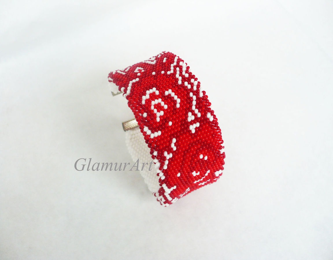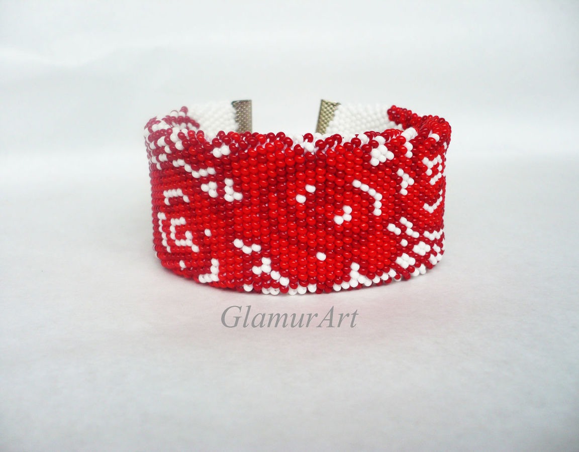 Браслет из бисера Кружевные Розы. Шикарный плоский браслет! Стильное бело-красное сочетание.