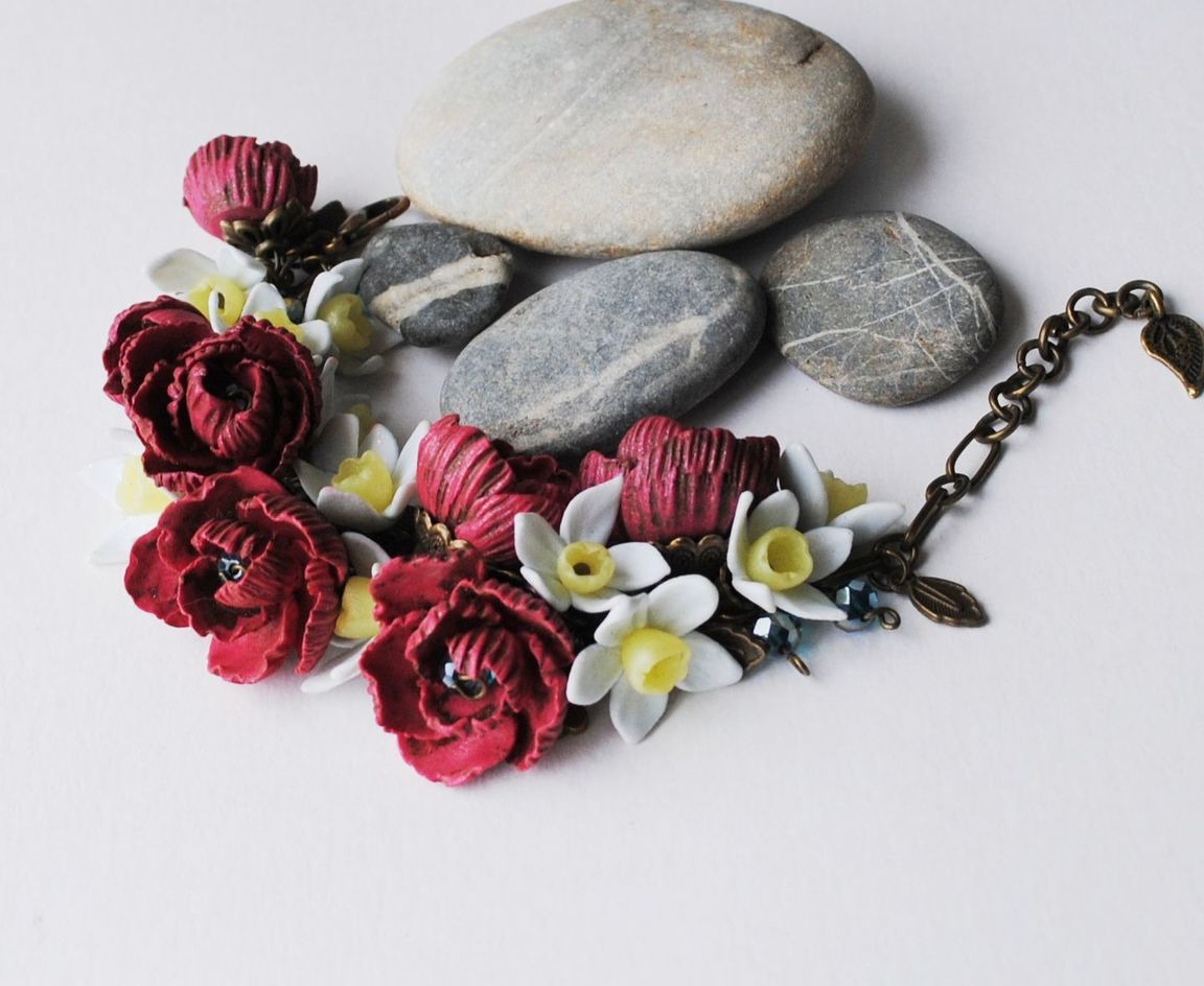 браслет из крупных стилизованных пионов, вылепленных вручную и нариссов, Это не попытка создать цветы "точь-в точь", а, скорее такая стилизация