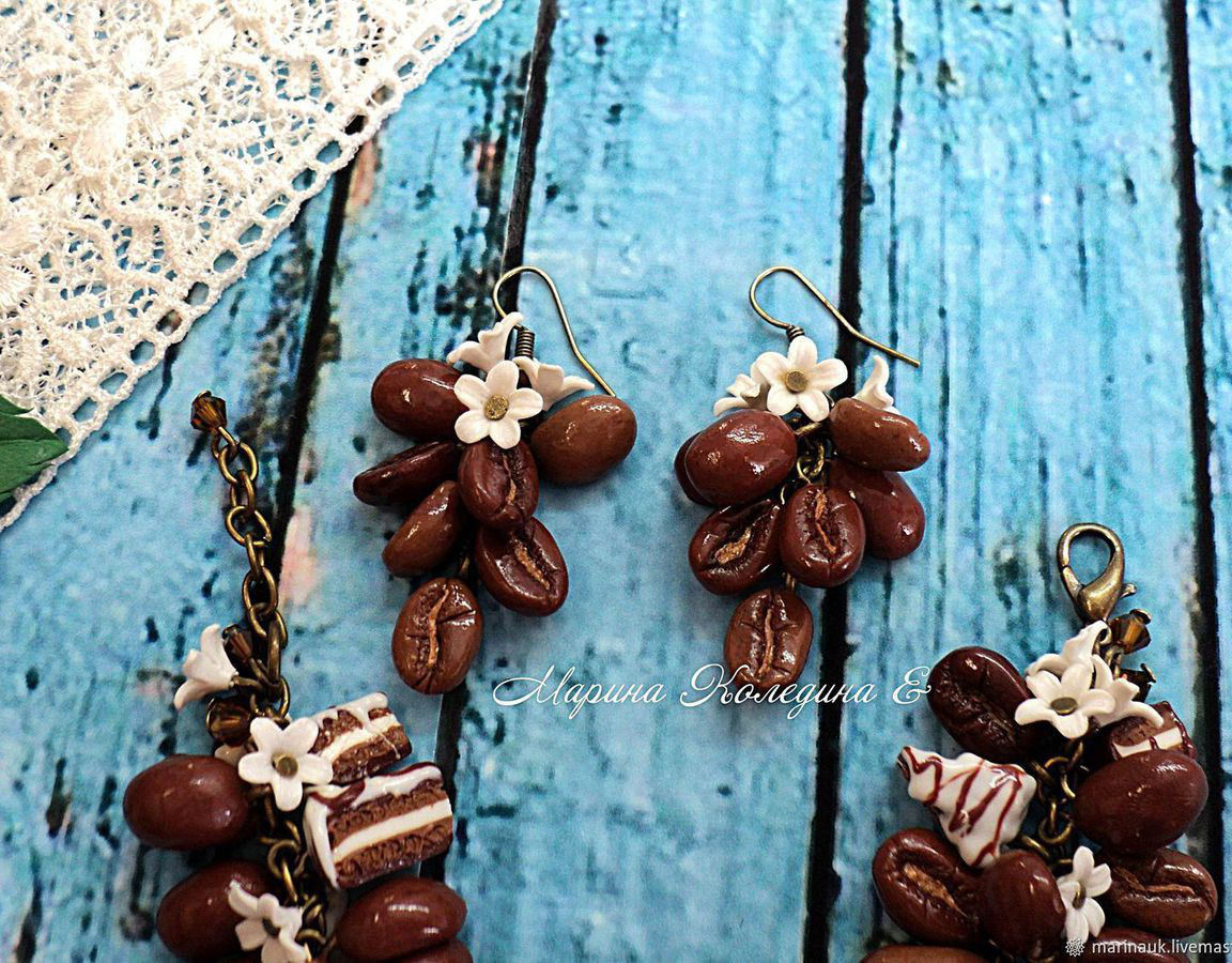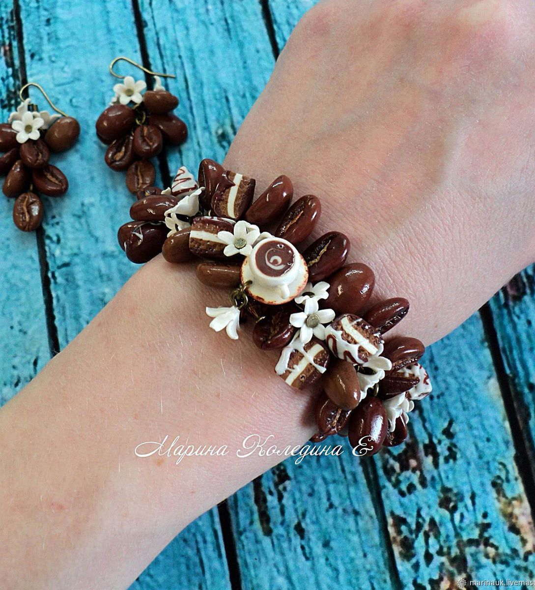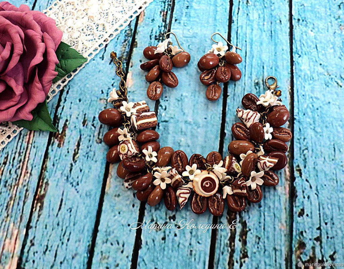 комплект, украшение, браслет, коричневый, серьги, бижутерия, браслет и серьги, полимерная глина, кофе, купить, из полимерной глины