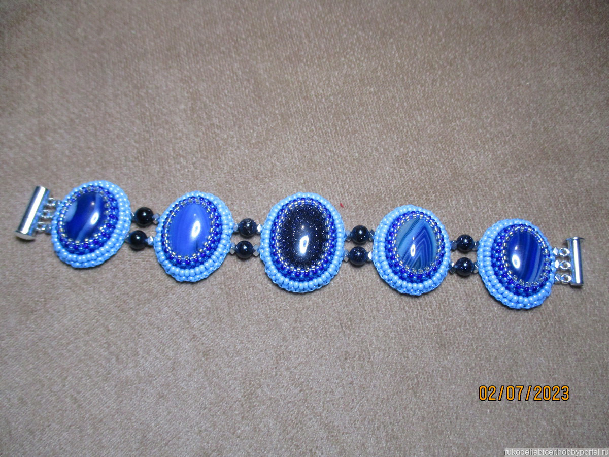 Браслет из кабашонов из камня. Синий авантюрин и агат. кабашоны оплетены чешским бисером и соединены бусинами авантюрина,между бусинами проставки из гематита под серебро. Замок магнитный слайсер, под серебро. Размер браслета 17 см.