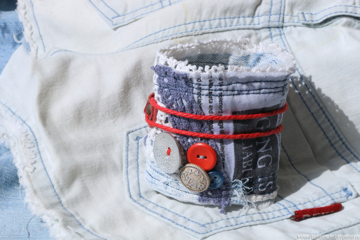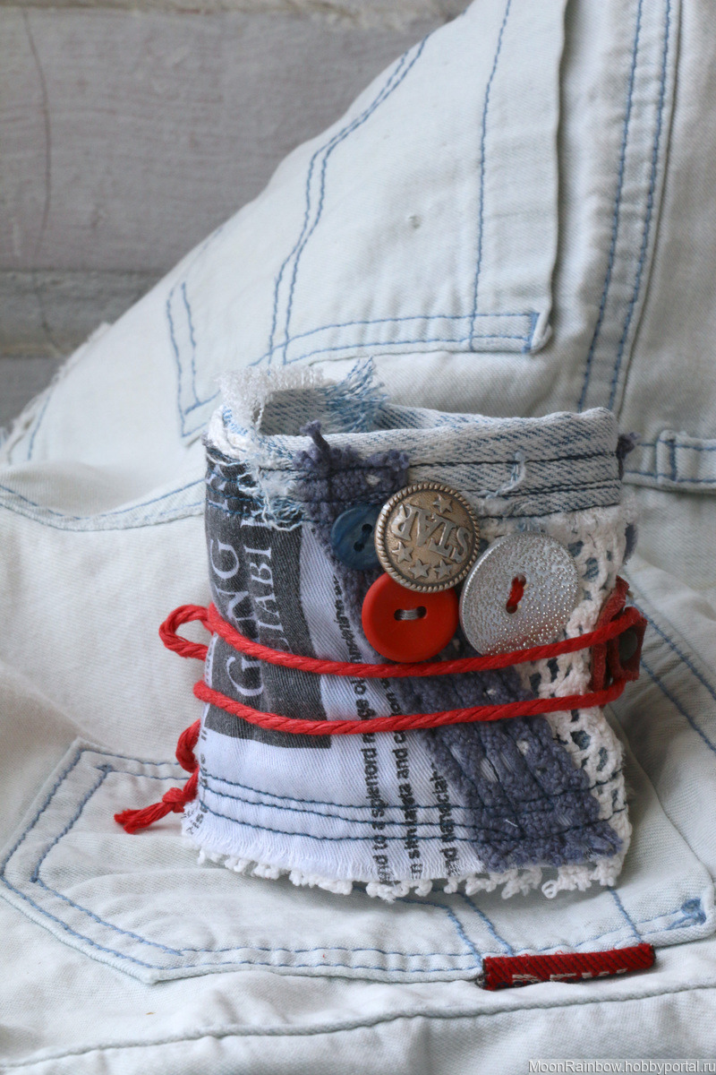 Широкий плотный браслет, именно напульсник в стиле 90х под джинсовку. Сшит из винтажных хлопка, джинсы и кружева и старой кожи. Декорирован алюминиевыми и пластиковыми чердачными пуговицами. На одной из пуговиц надпись Star (звезды сошлись)))). Надевается на запястье весьма оригинальным способом. Красный шнур, а затем и кожаная часть браслета продеваются в широкую прорезь, шнур обматывается вокруг запястье еще раз и накидывается на пуговицу.