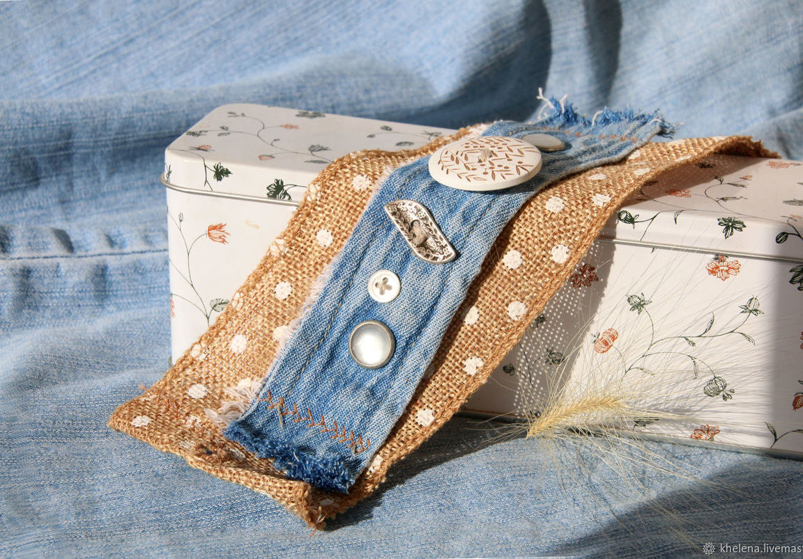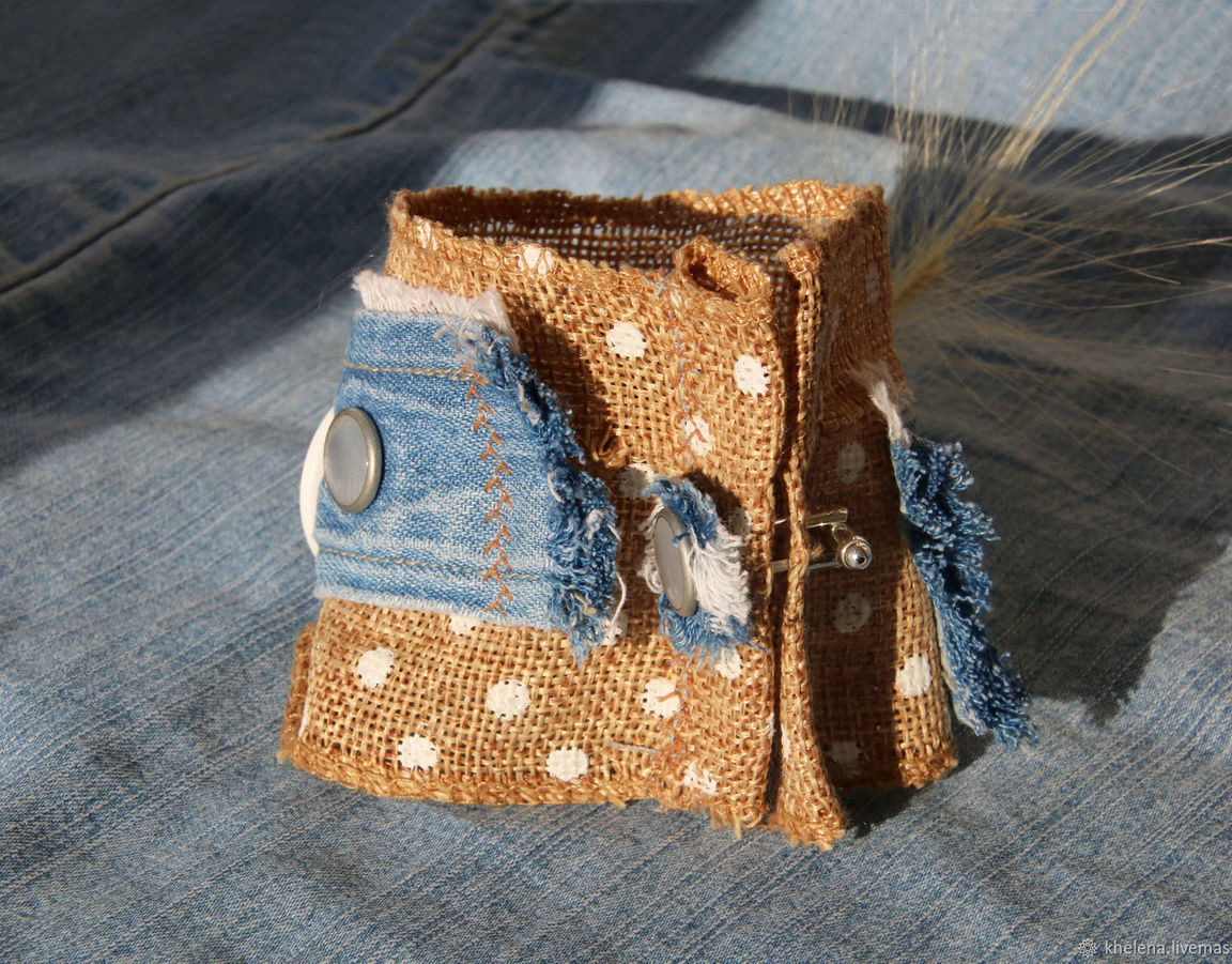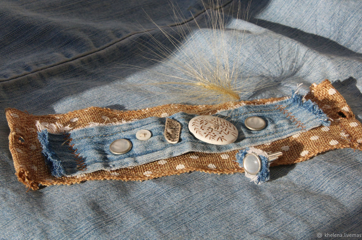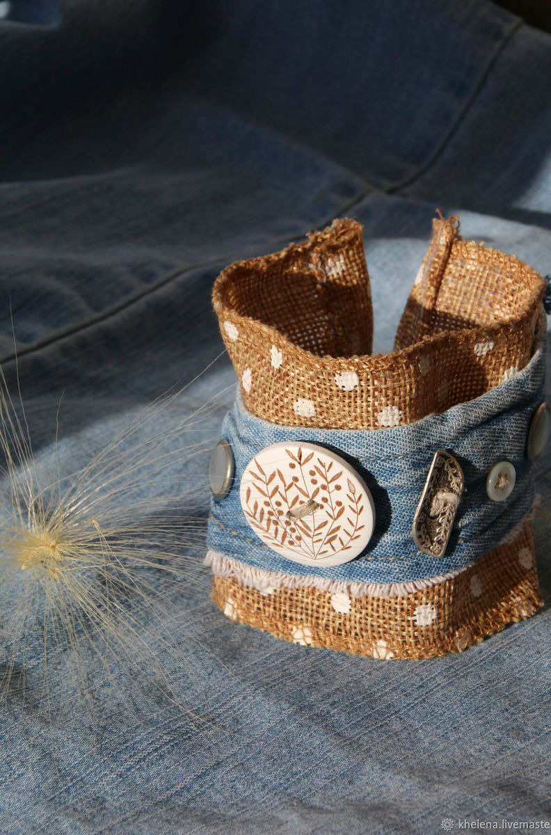 голубой, бежевый, пуговицы, деним, браслет манжета, в белый горошек, пшеничный цвет