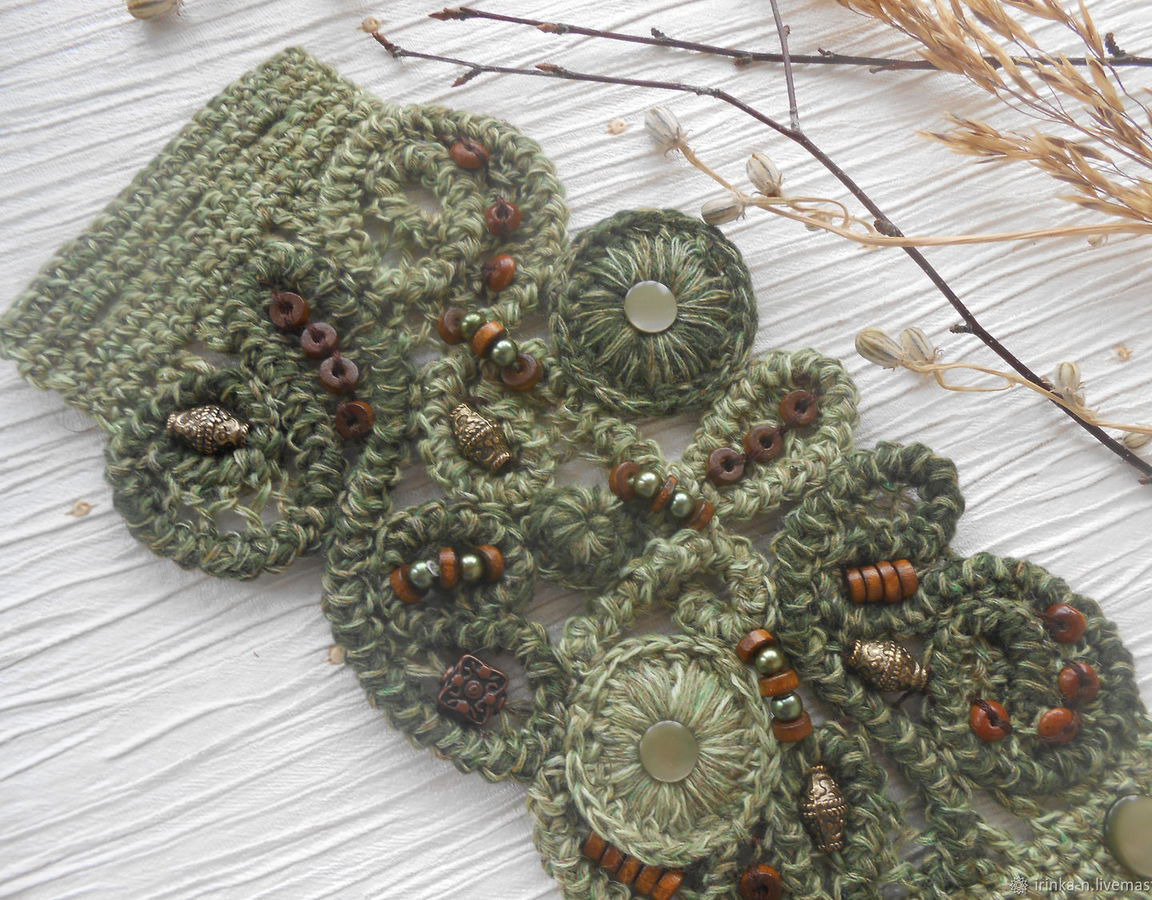 Оригинальное , стильное украшение в стиле бохо - Кружевной вязаный браслет -манжета "Дух леса "