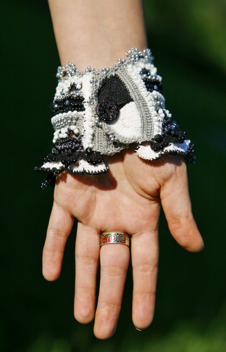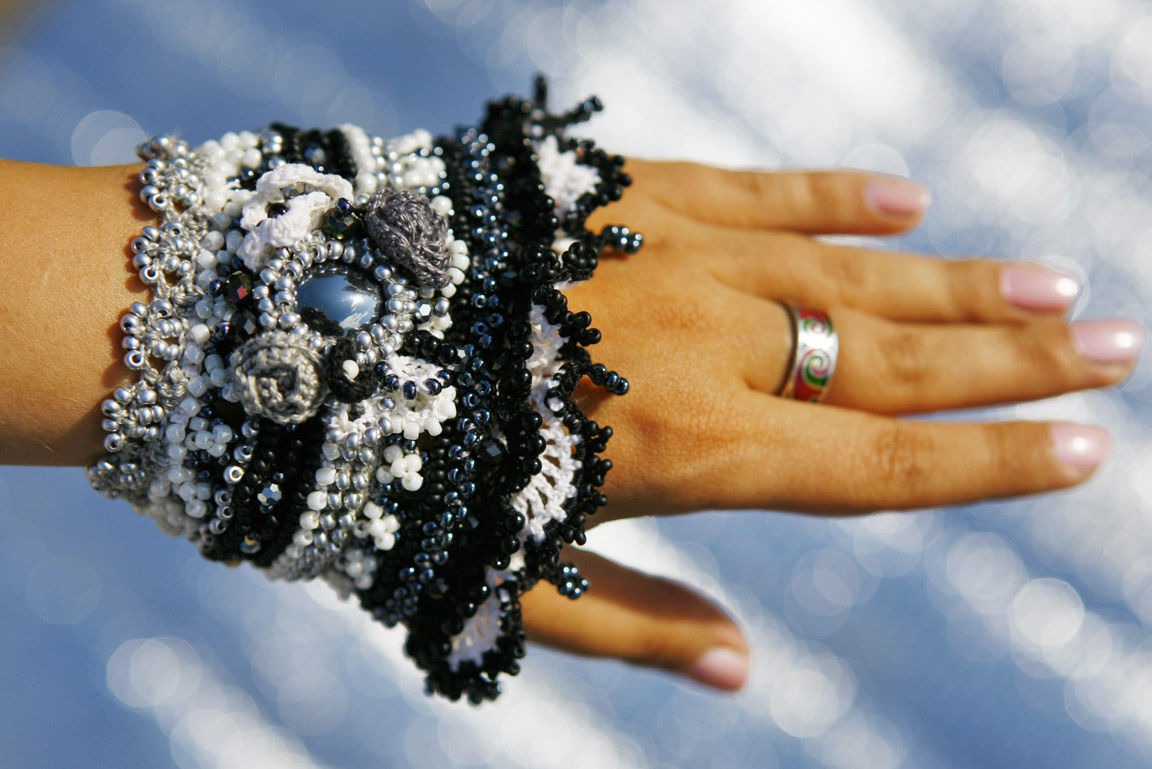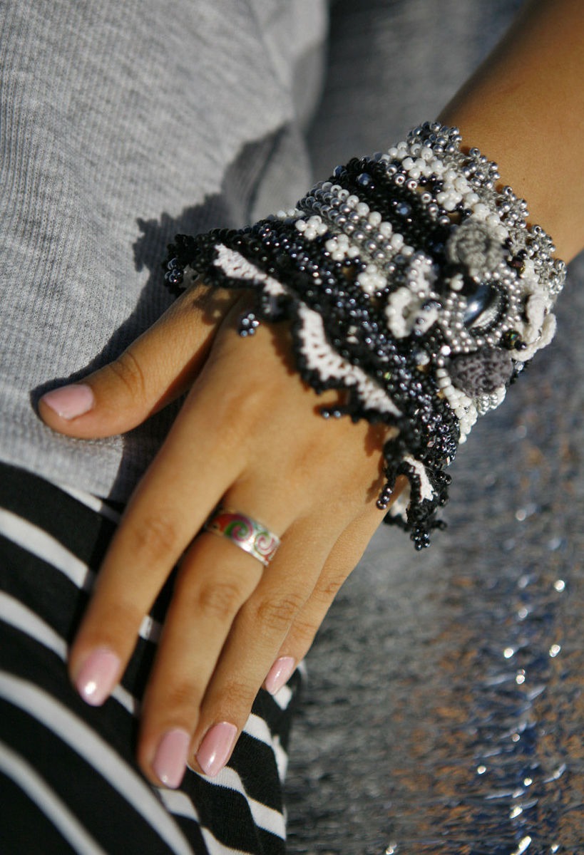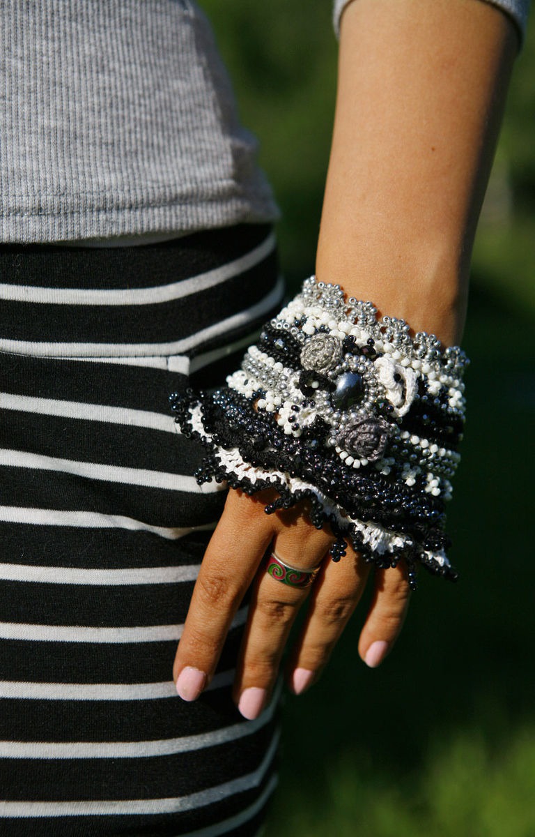черно-белый, авторские украшения, авторская бижутерия, кафф, кафф ручной работы, браслет с камнями, бохо браслет, браслет с бисером, стильный браслет, манжета, манжет, монохромные браслеты, браслет из кожи