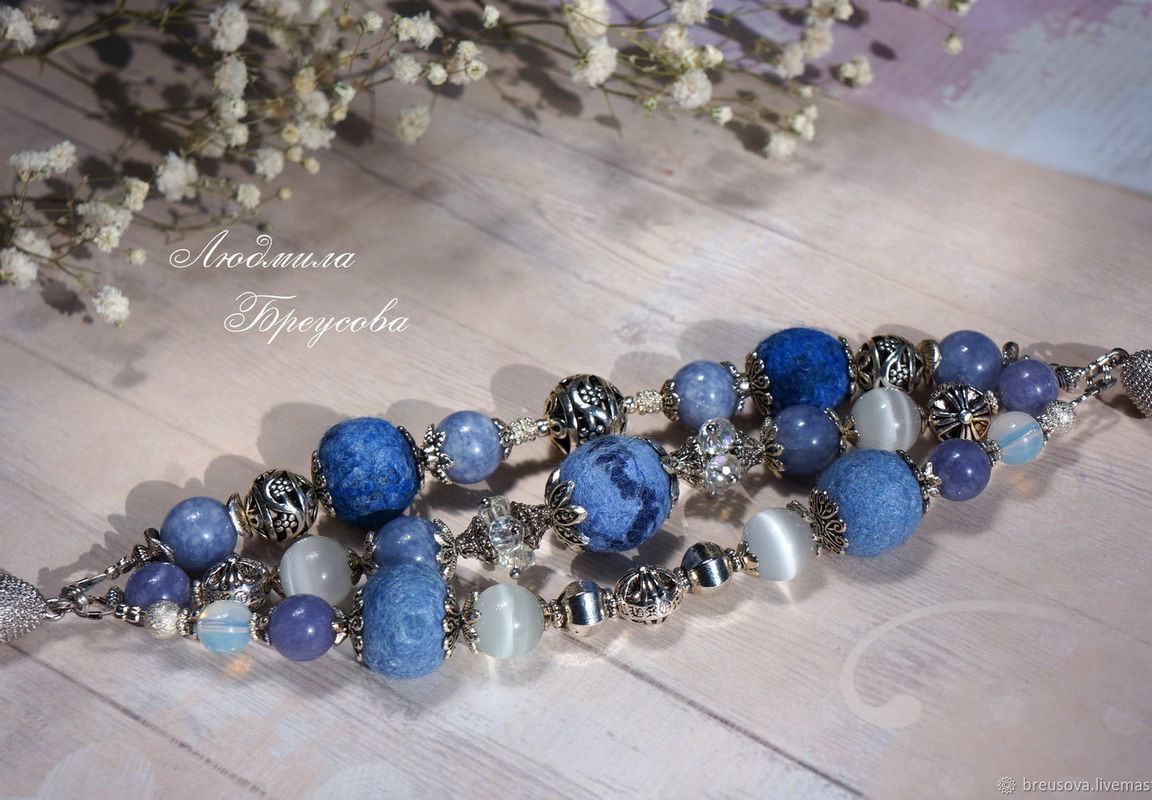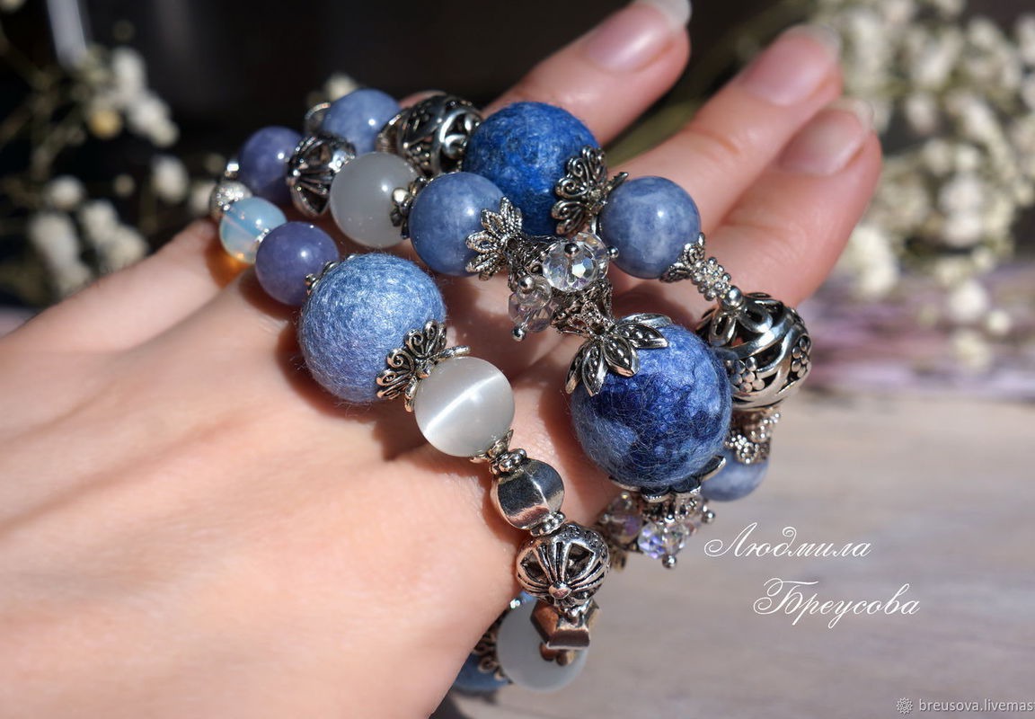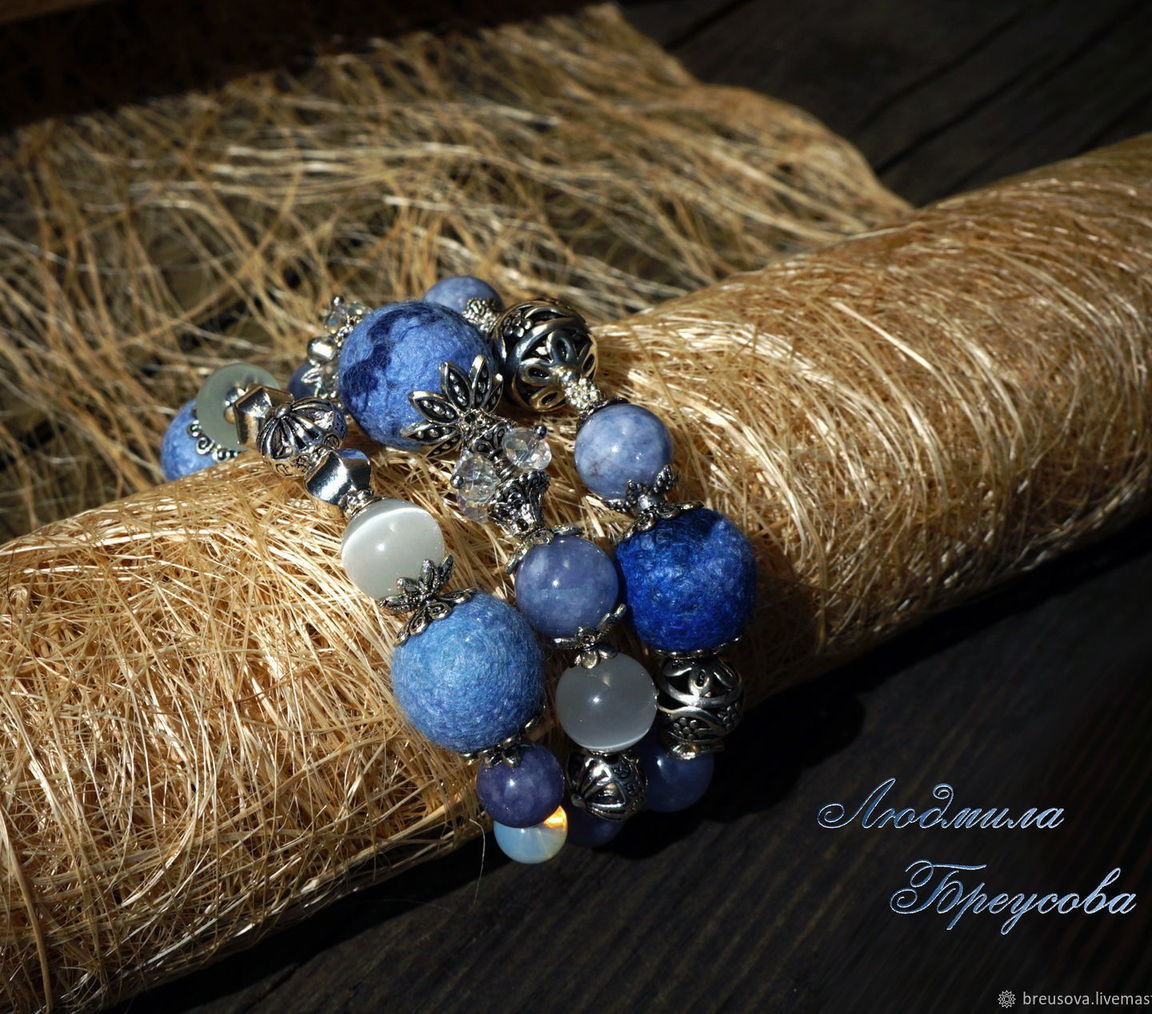 браслет, голубой браслет, авторские украшения, браслет ручной работы, текстильный браслет, небесно-голубой, крупный браслет, тройной браслет, браслет из войлока, войлок и минералы