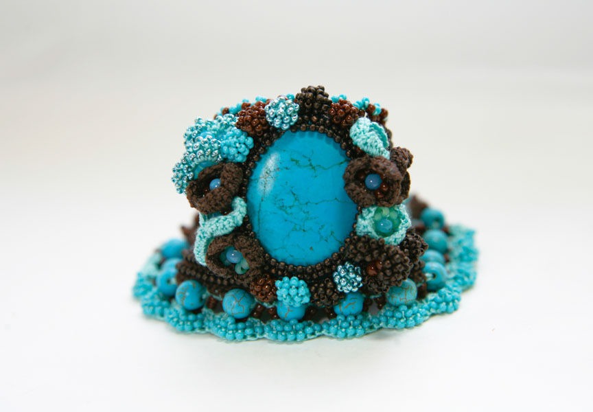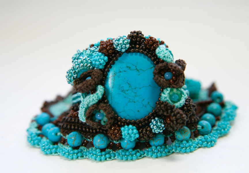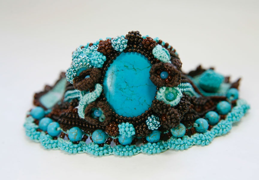браслет из бисера, вязаный браслет, бирюза и шоколад, женственный браслет, браслет крючком, бохо браслет, catterins, catterinsart, элегантный браслет, бирюзово-коричневый, браслет с бирюзой, браслет с бисером