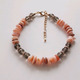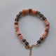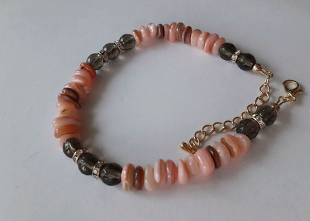 Браслет выполнен из бусин дымчатого кварца с огранкой (6 мм) и натурального перламутра (тонированного) бежево-розового цвета (3 мм х 8 мм) гладкой шлифовки. Между бусинами кварца расположены коннекторы со стразами.