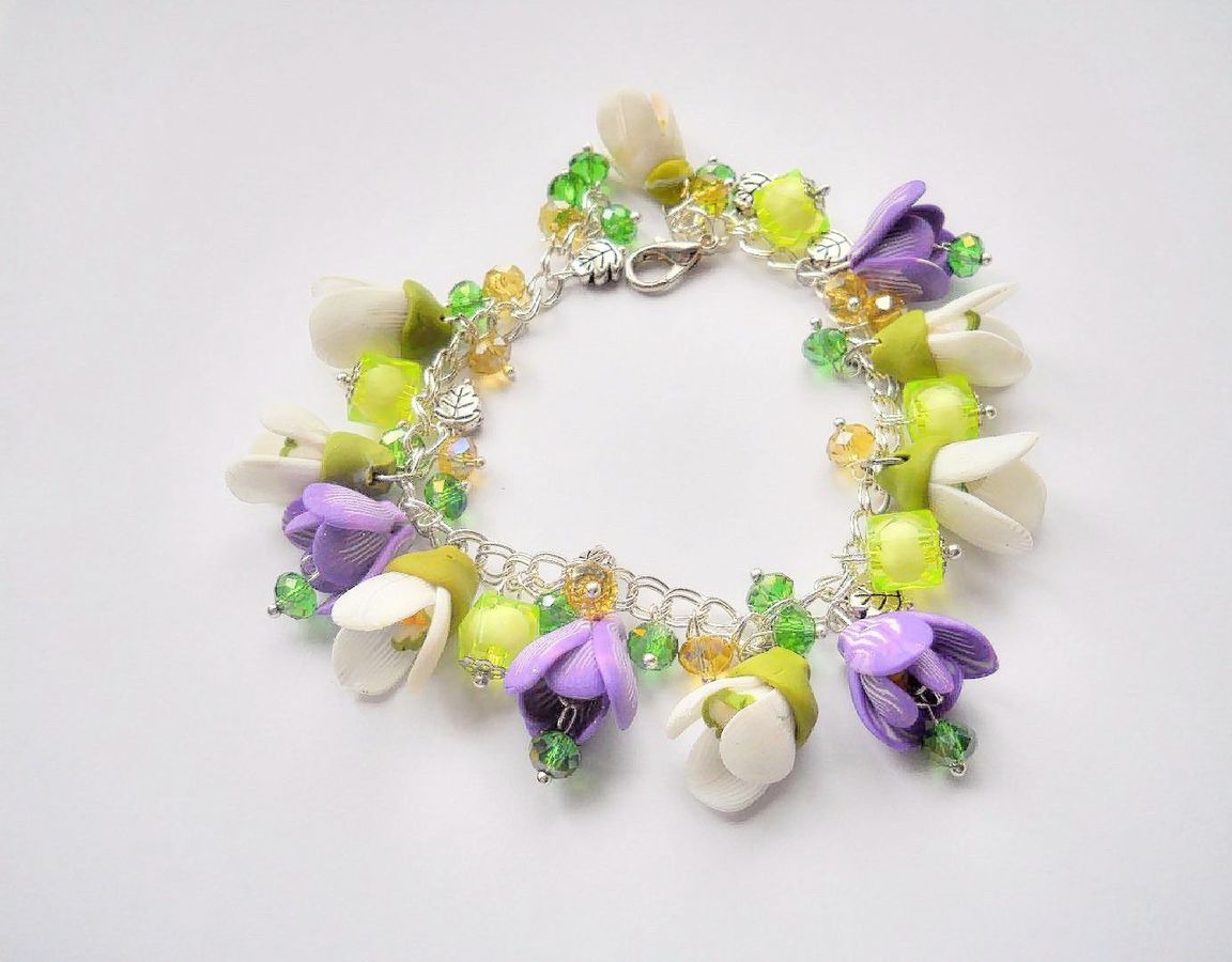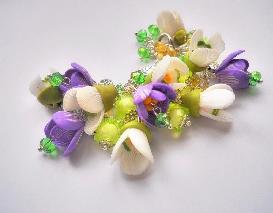 ручная работа, подарок девушке, браслет с цветами, браслет ручной работы, комбинированный, купить браслет, цветочное украшение, браслет из полимерной, браслет с кристаллами, нарядный браслет, браслет с хрусталем