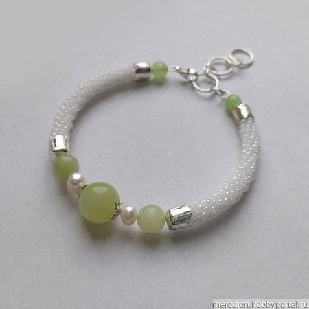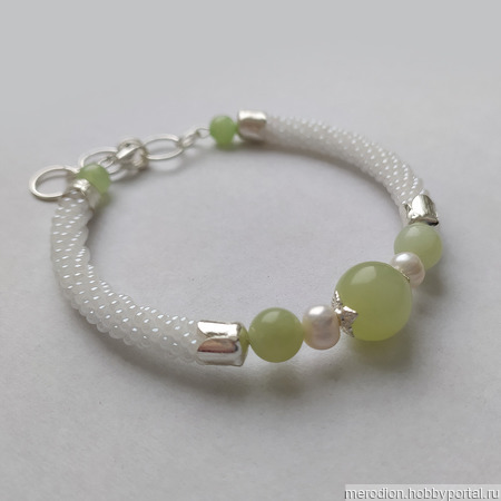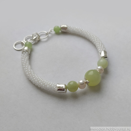 Браслет изготовлен из чешского бисера белого цвета с легким глянцевым блеском, а также из натурального нефрита, речного жемчуга и пары бусин оникса.