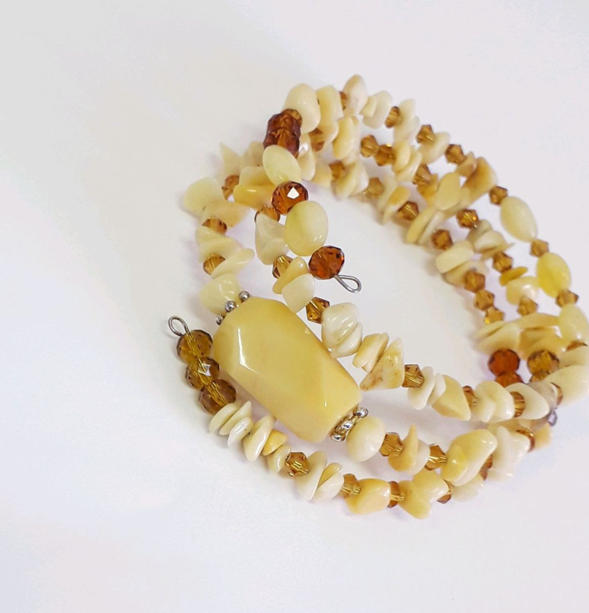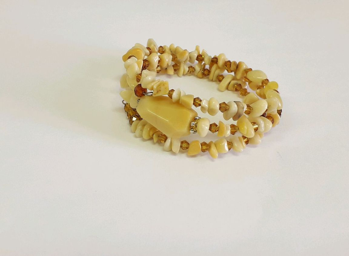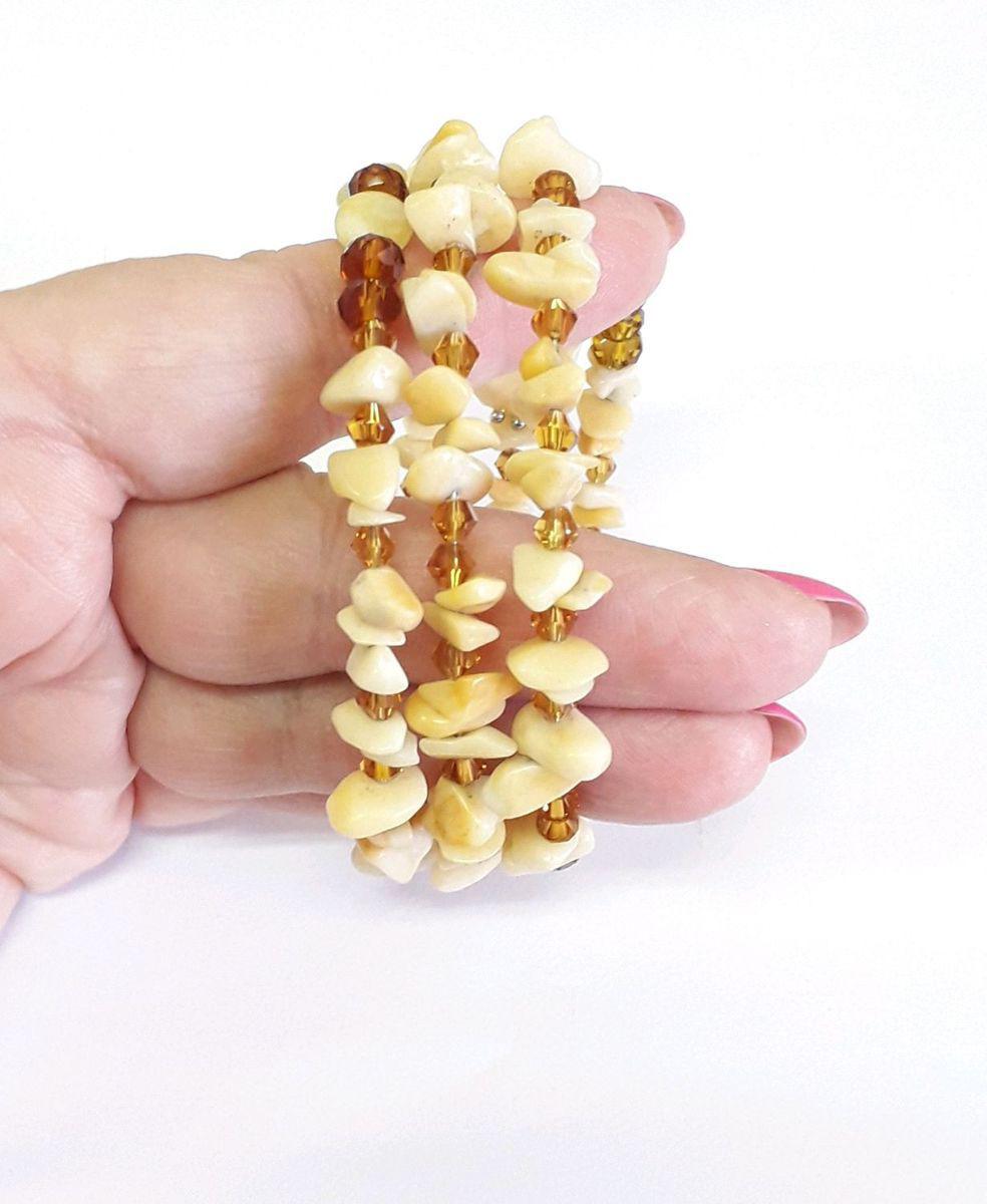 Браслет выполнен из бусин-чипсов (5-8 мм) натурального воскового опала. Центральное место занимает крупная бусина с огранкой овальной формы (24 мм х 15). Цветовая гамма от молочно-желтого до медового. НЕ ТОНИРОВАН.