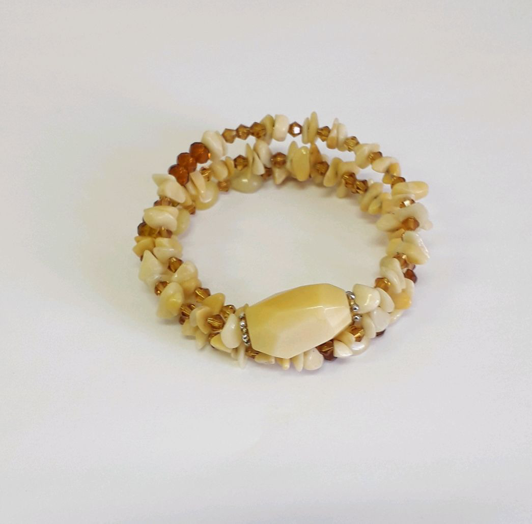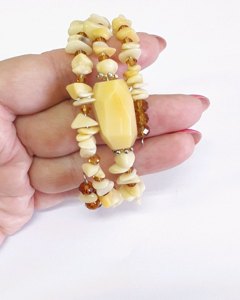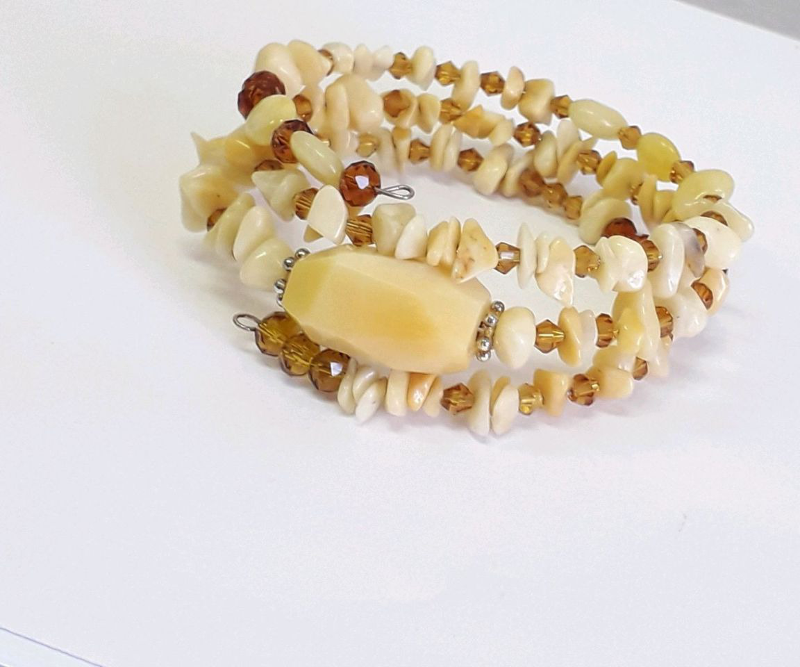 Браслет выполнен из бусин-чипсов (5-8 мм) натурального воскового опала. Центральное место занимает крупная бусина с огранкой овальной формы (24 мм х 15). Цветовая гамма от молочно-желтого до медового. НЕ ТОНИРОВАН.
