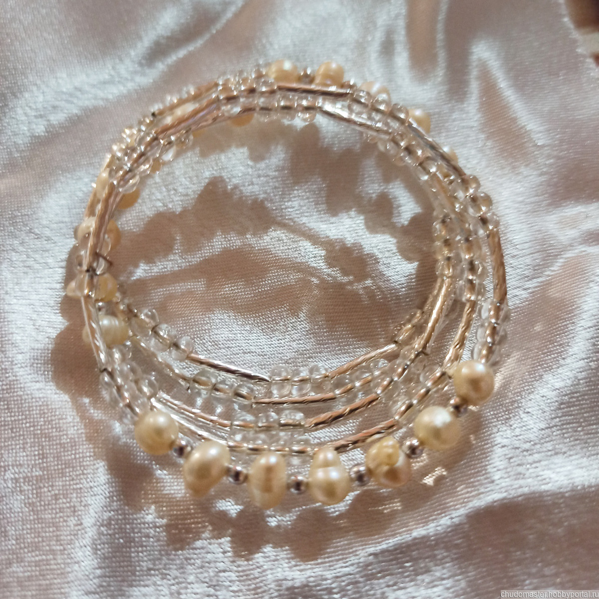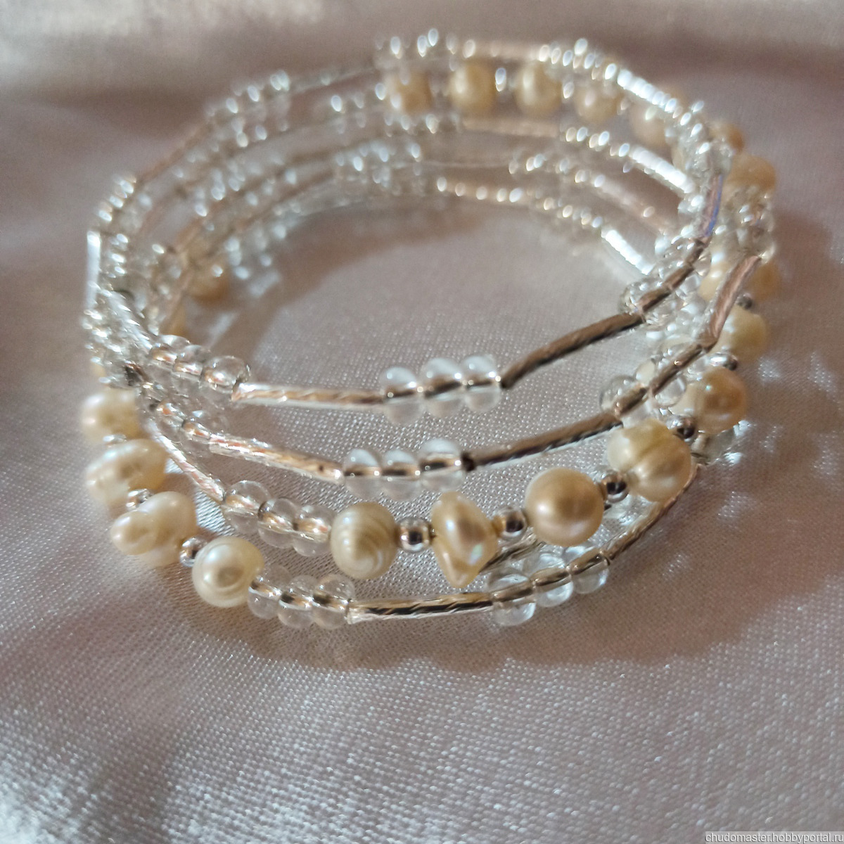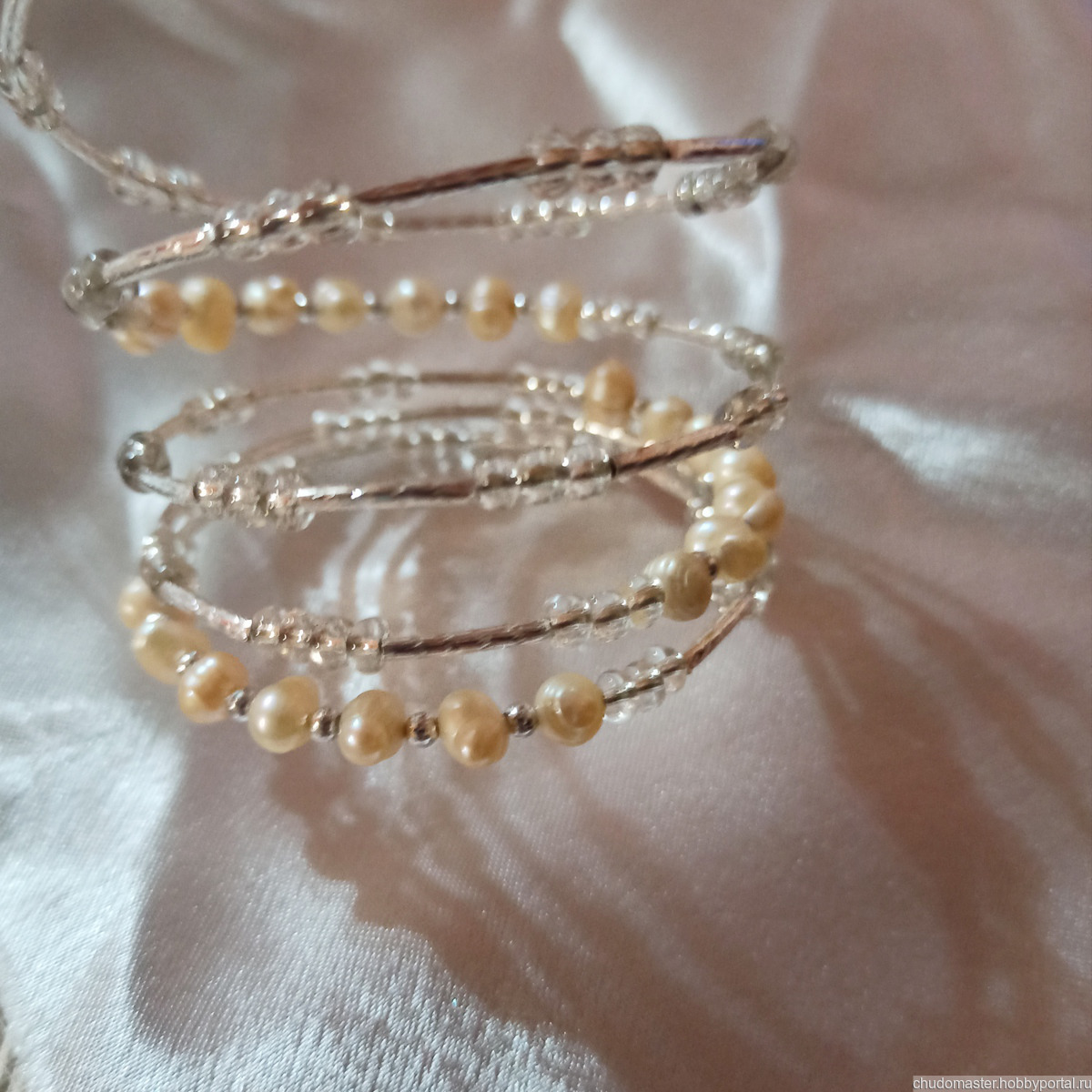 Пятирядный браслет с 21й пресноводной жемчужиной и стеклянным бисером с использованием мемори проволики (проволоки с памятью), что позволяет не беспокоиться о порыве или застежке.