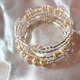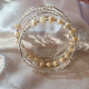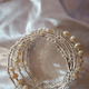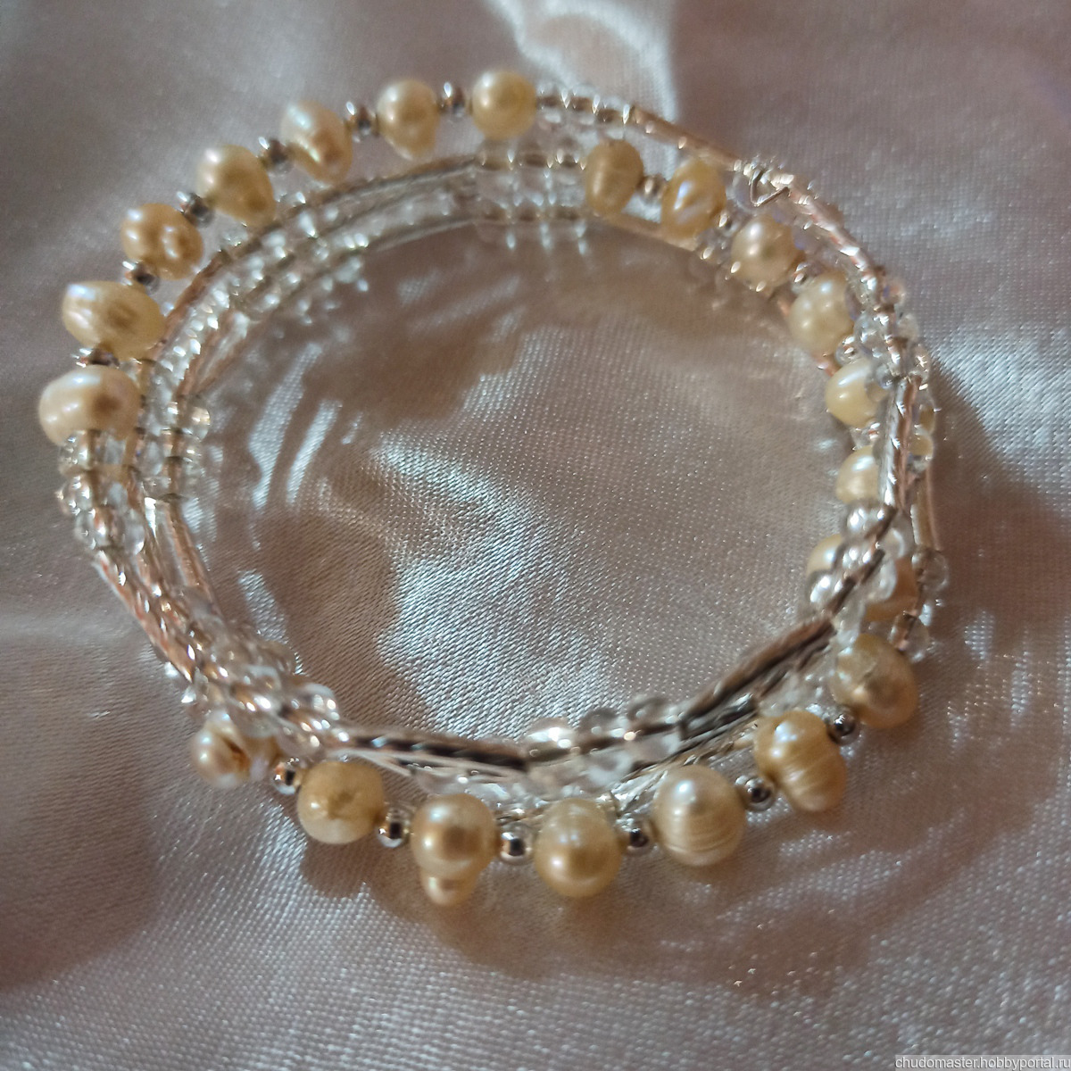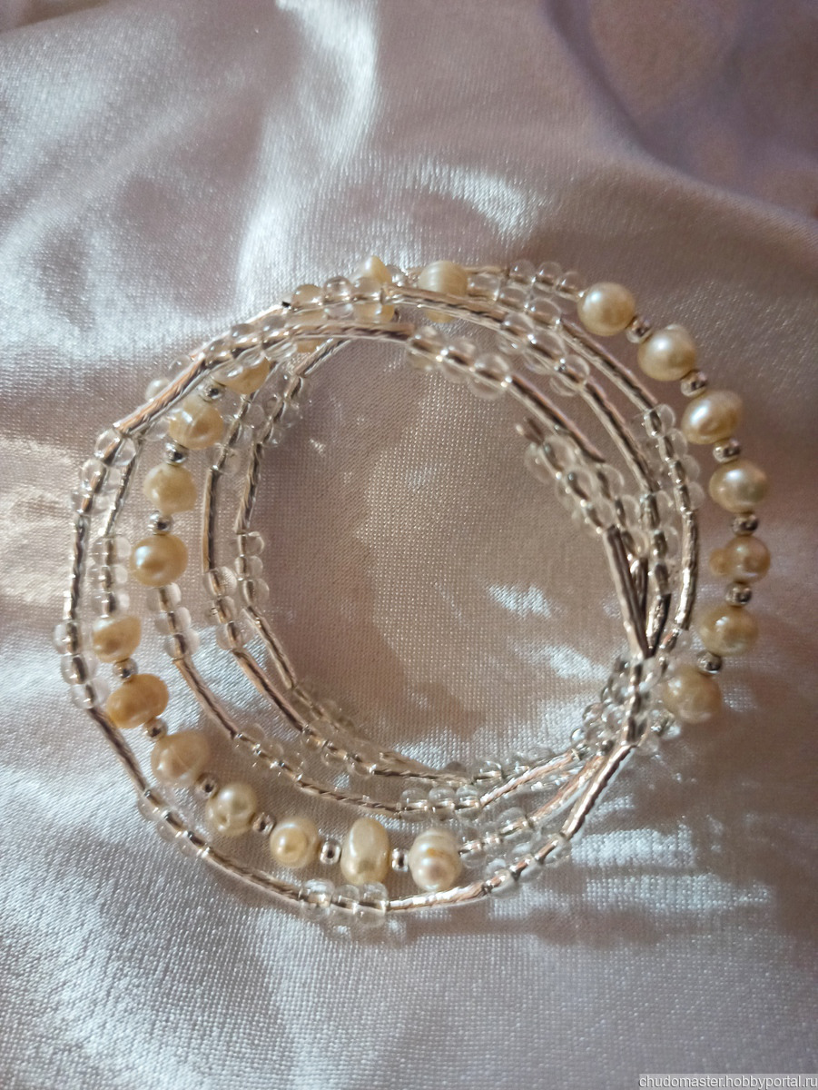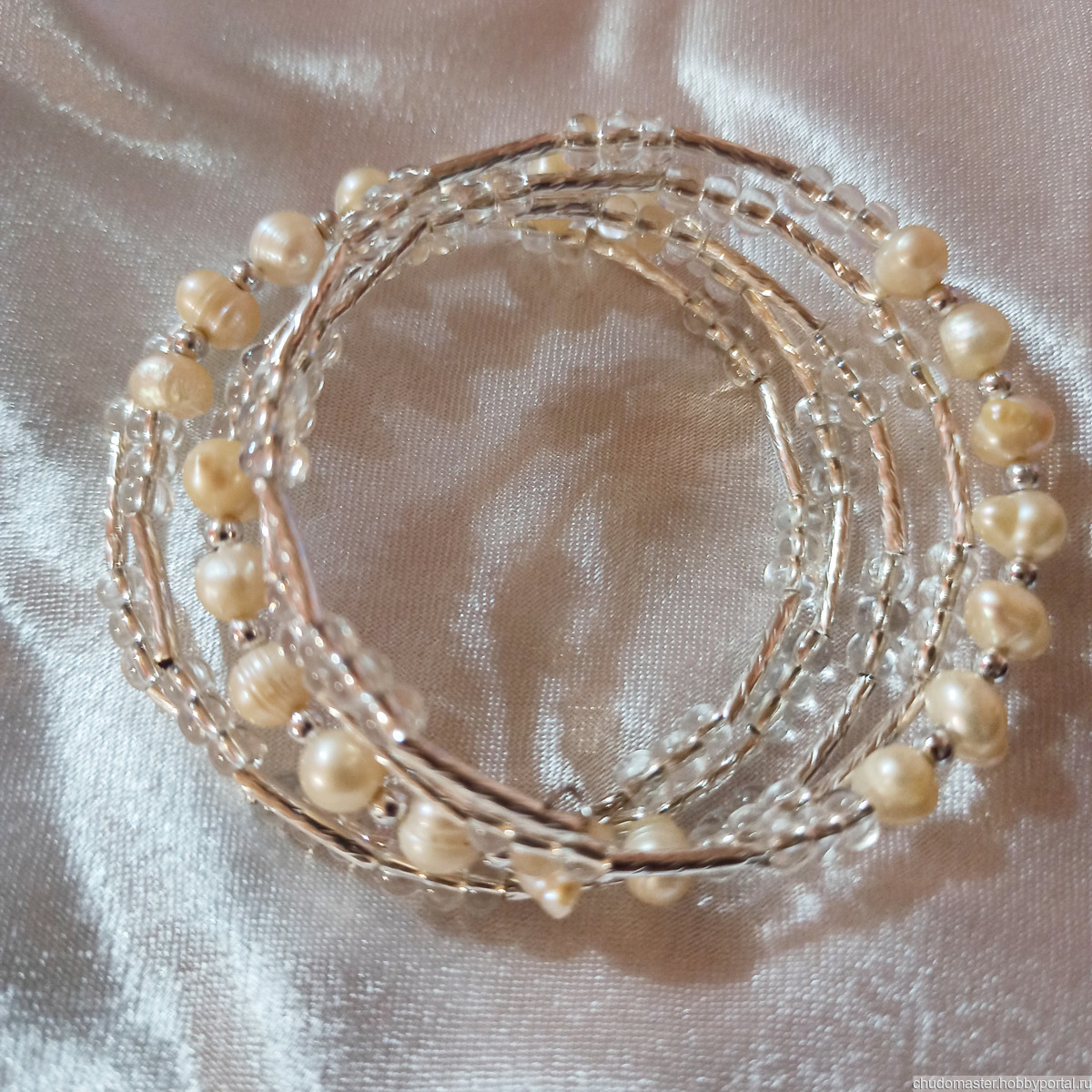Пятирядный браслет с 21й пресноводной жемчужиной и стеклянным бисером с использованием мемори проволики (проволоки с памятью), что позволяет не беспокоиться о порыве или застежке.