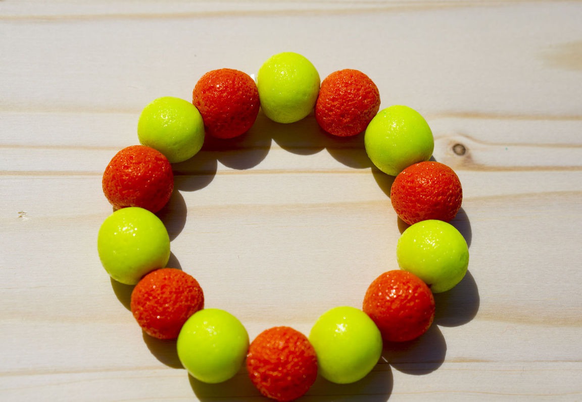 Бусинки из которых сделан браслет напоминают, сочные цитрусовые, в этом браслете вы не останетесь незамеченной.