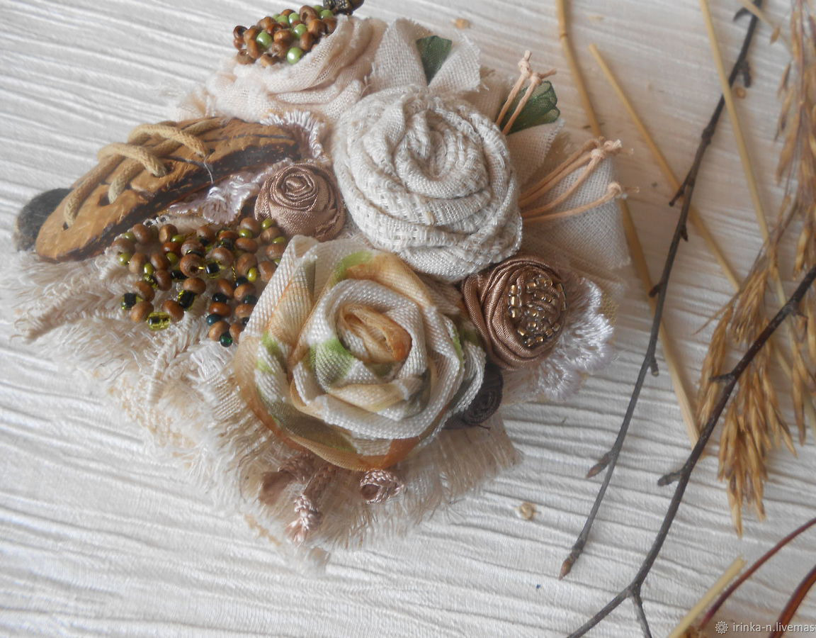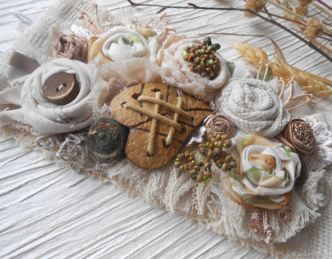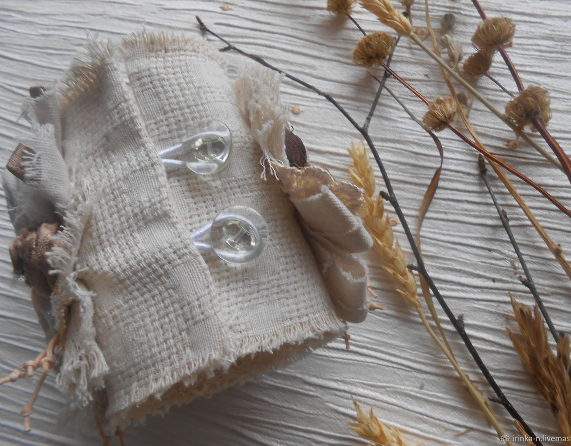 Браслет сделан из различных тканей светлых тонов - два вида льна , льна с цветной органзой , шелка , кружева х/б