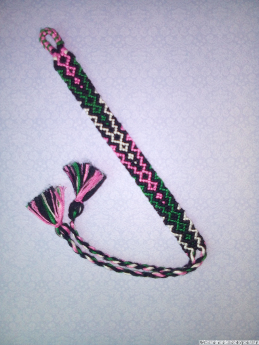 Благодаря сочетанию розового и зелёного цветов,а также кисточкам на завязках, вы будете выглядеть эффектно, но не броско.