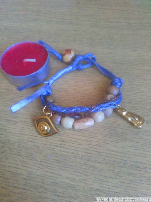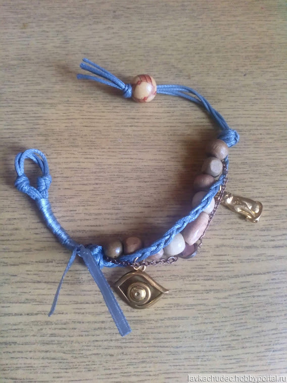 атласная лента, деревянные бусины, подвески металлические, цепочка под бронзу, шнур синтетический