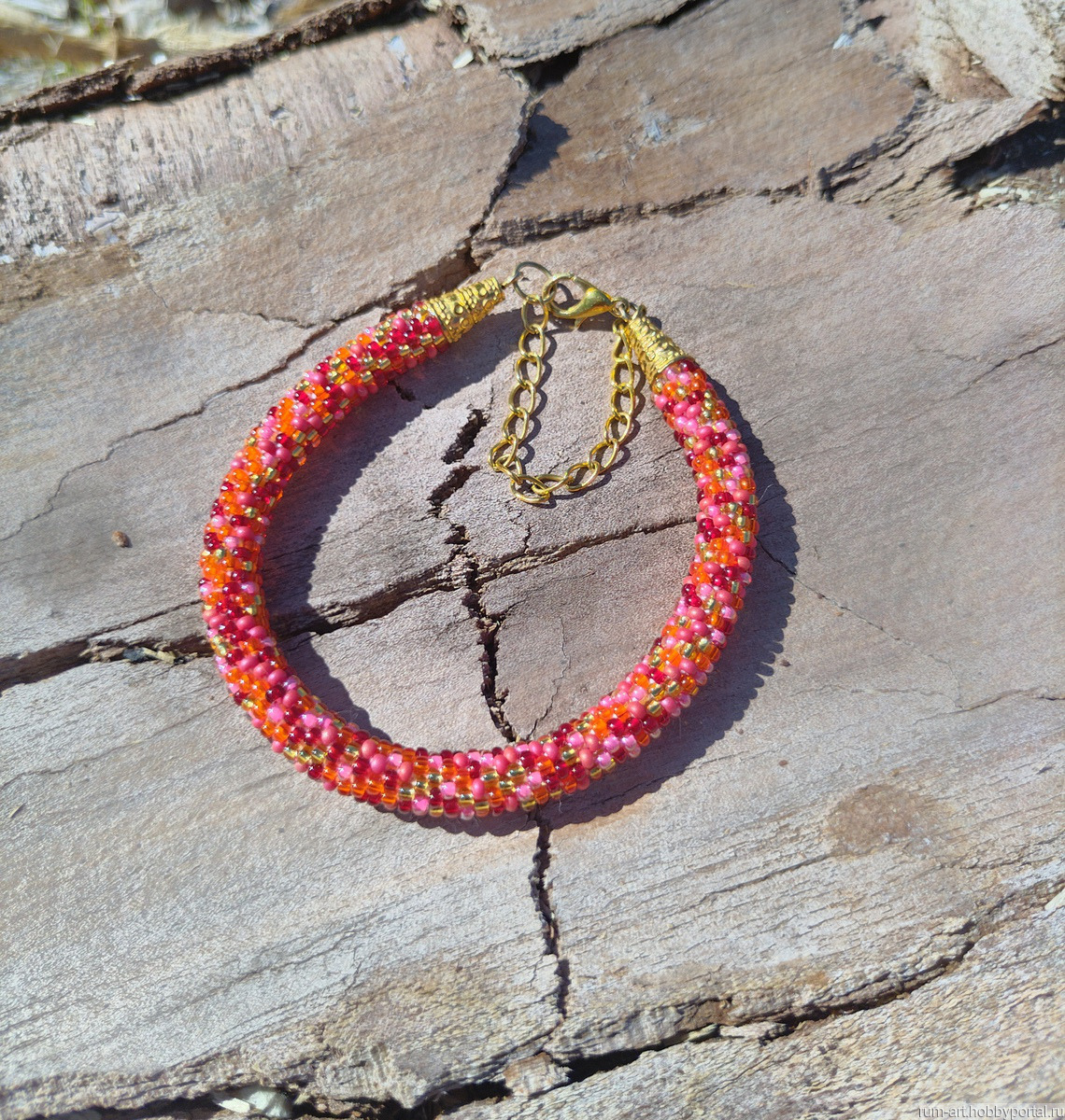 Браслет Сладость из чешского бисера в розово-золотистом цвете, вязаный крючком.