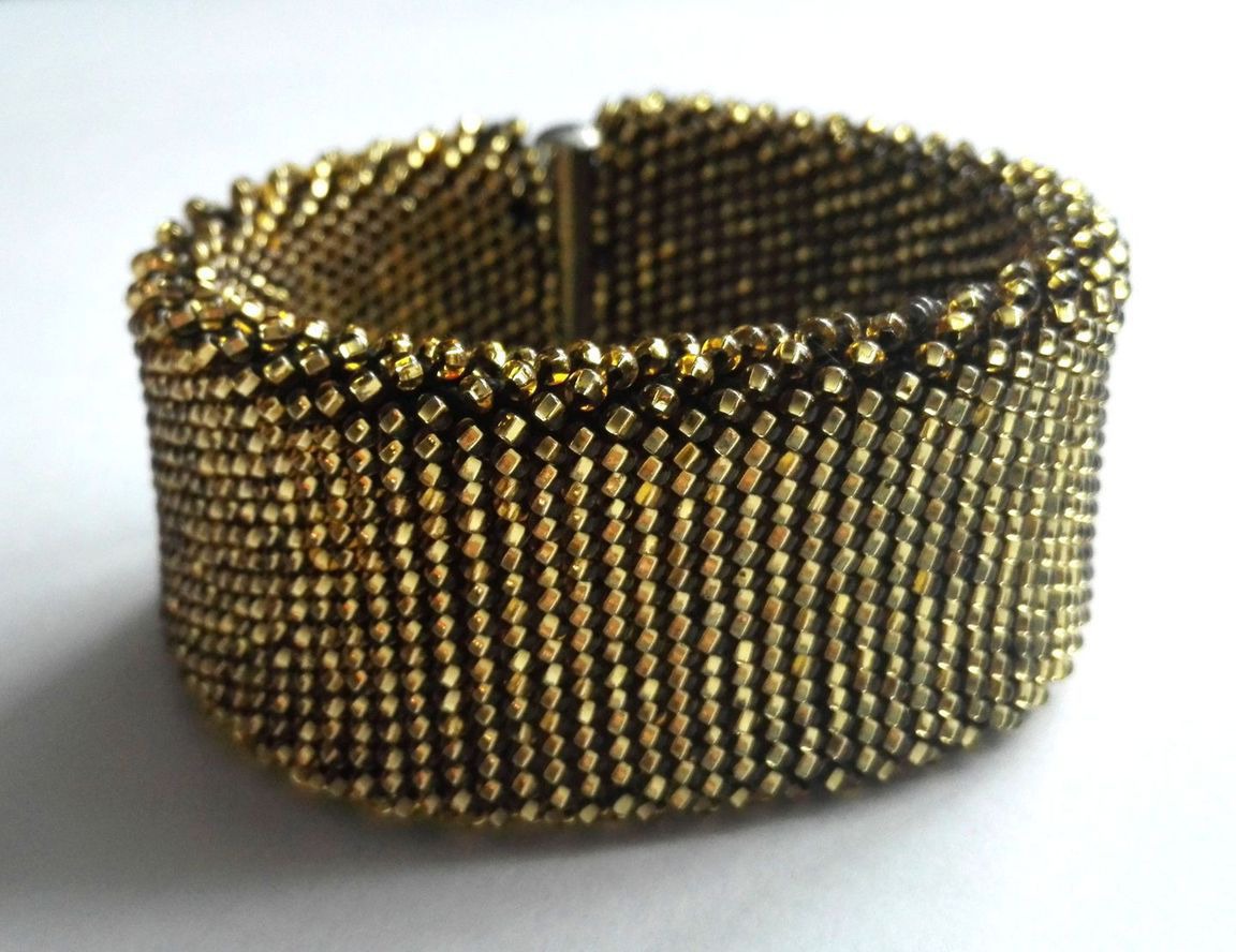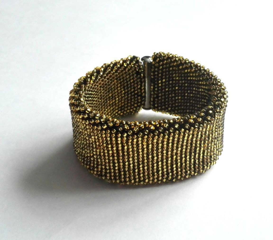 золотой, браслет, браслет из бисера, браслет ручной работы, широкий браслет, золотой браслет